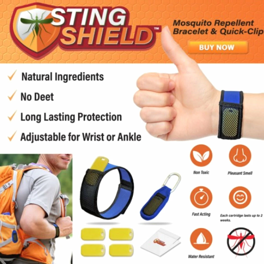 Sting Shield the mosquito repellent bracelet and quick clip helps keep mosquitoes away! Sting Shield uses a cartridge made of a natural herbal blend of Citronella, Geranium, Peppermint and Lavender to help protect you from pesky mosquitoes. No messy sprays or lotion. The bracelet secures with simple hook and loop fastener and its sleek, comfortable, fully adjustable design gives you the freedom to go anywhere.