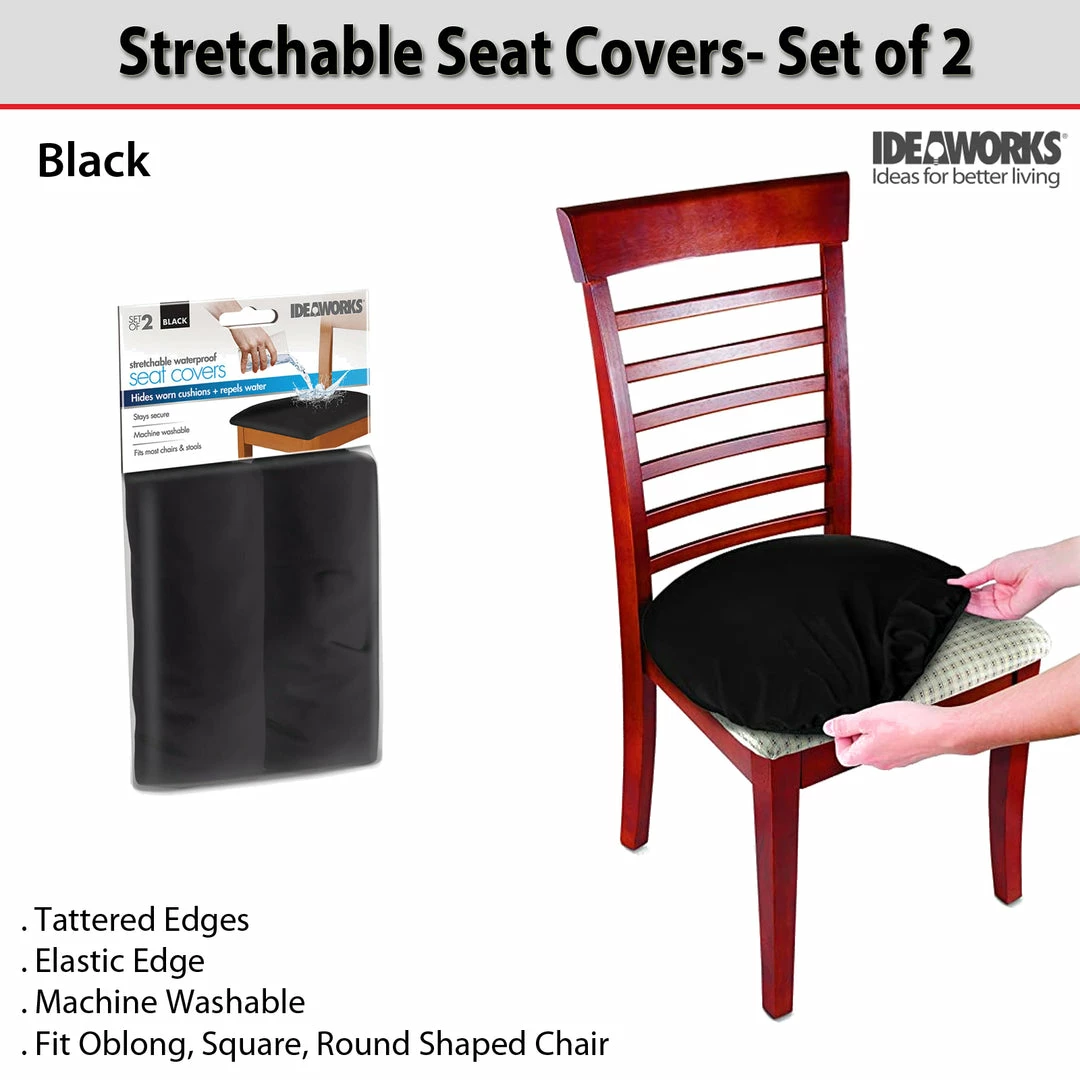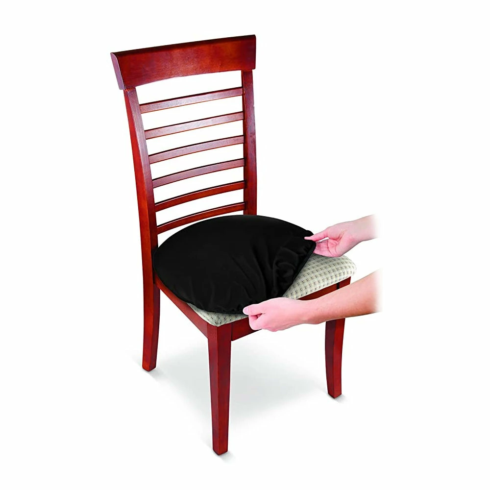 Chair covers stretch to fit oblong, square, round shaped chair seats. Hides wear and tear, rips, and tattered edges. Elastic edge holds cover securely in place. Fits office chairs, dining room chairs, bar stools, patio chairs, and more. Machine washable.