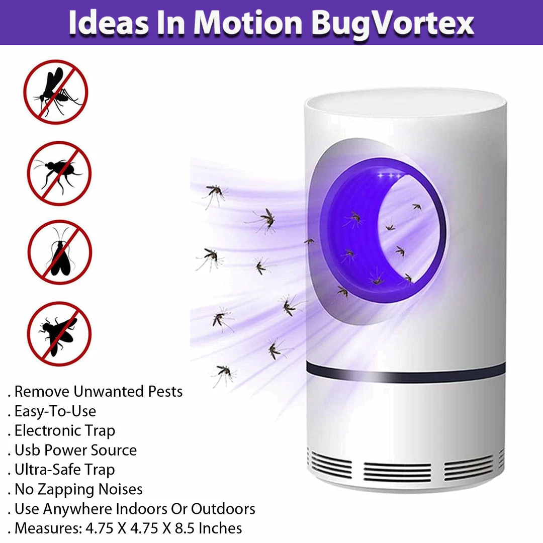 Remove unwanted pests from the air such as mosquitoes, gnats, fruit flies, and other small flying insects with Ideas in Motion Photocatalysis BUGVORTEX. This easy-to-use electronic trap plugs into any USB power source and lures bugs inside with ultraviolet light. Once the bugs fly too close to the light, the fan vortex sucks them in and traps them inside. Our ultra-safe trap requires no high voltage and is whisper quiet with no zapping noises. Use anywhere indoors or outdoors. Works with power banks. Use for camping, on patio deck, or on-the-go.
