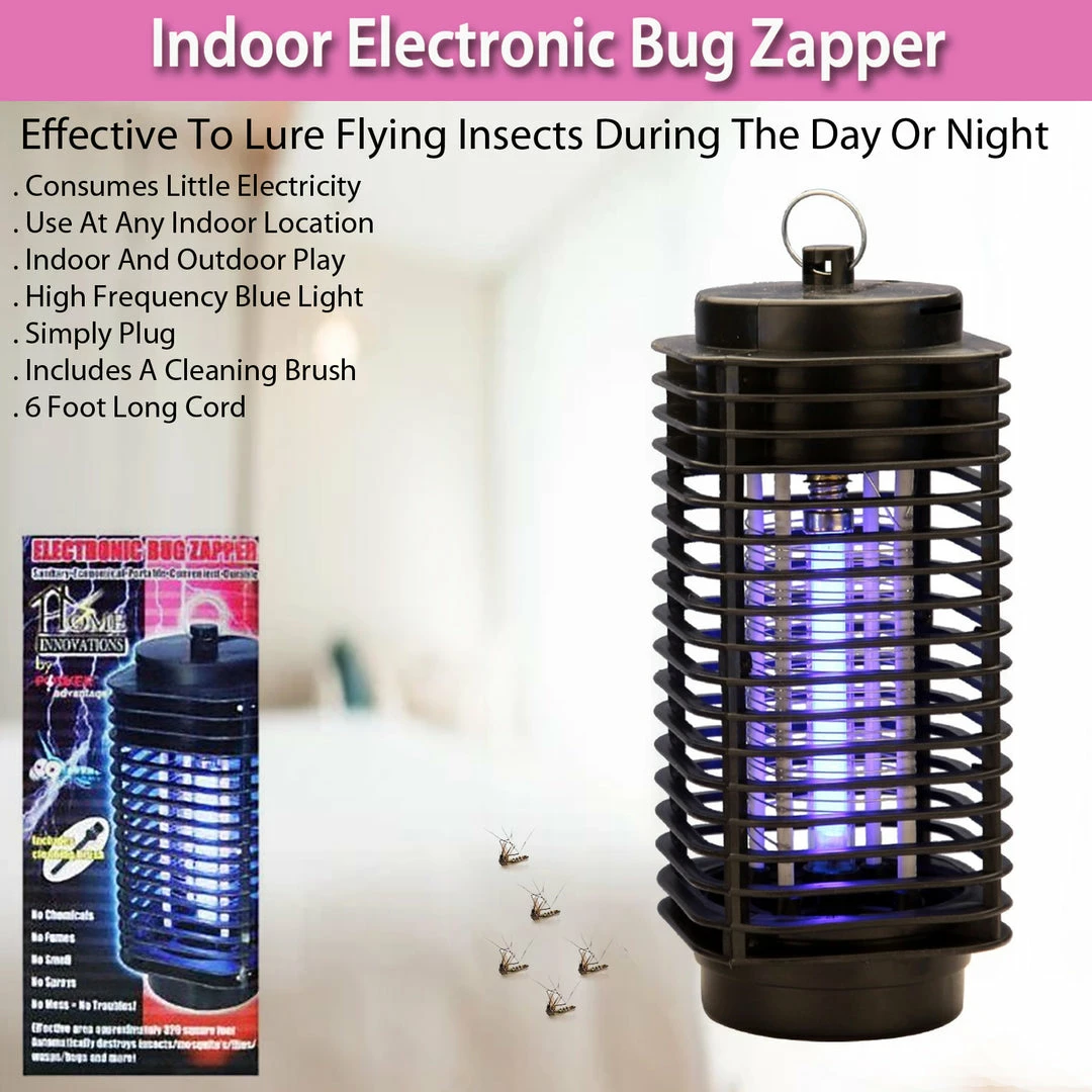 Home Innovations By Power Advantage Indoor Electronic Bug Zapper Ideal for use at any indoor location such as houses, apartments, factories, shops, warehouses, hotels, restaurants and more. The electronic bug zapper utilizes a high frequency blue light which is proven to be the most effective to lure flying insects during the day or night to form a practical, efficient, hygienic and automatic electronic insect extermination system. Simply plug the bug zapper into an electric outlet so that flying or crawling insects nearby will be attracted to the light and approach the electrically charged metal grid which will result in their electocution. Effective area approximately 320 sq ft. Automatically destroys insects, mosquito’s, flies, wasps, bugs and more. Sanitary, economical, portable, convenient and durable. Includes a cleaning brush and 6 foot long cord to kill bugs all around the home or office. Features: No chemicals No fumes No Smell No Sprays No mess = no troubles Includes: Indoor Electronic Bug Zapper 1 x Cleaning brush