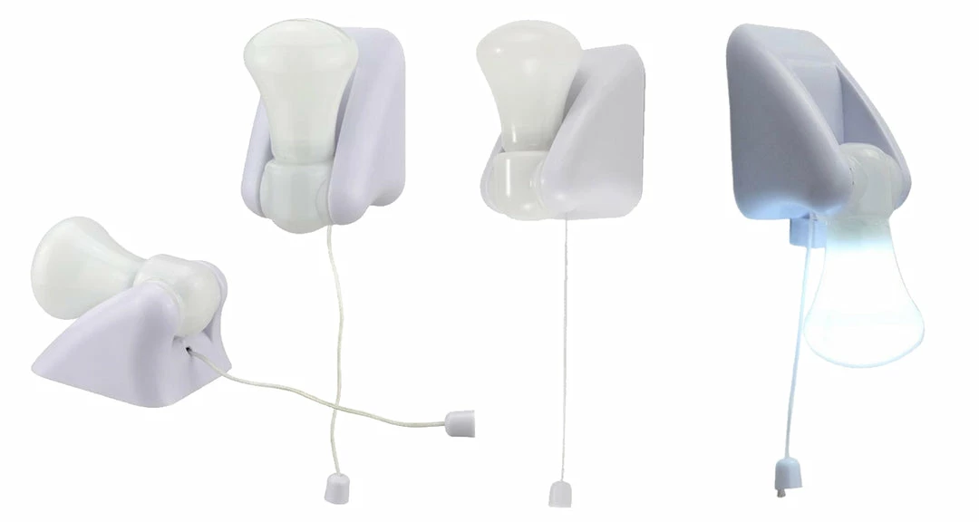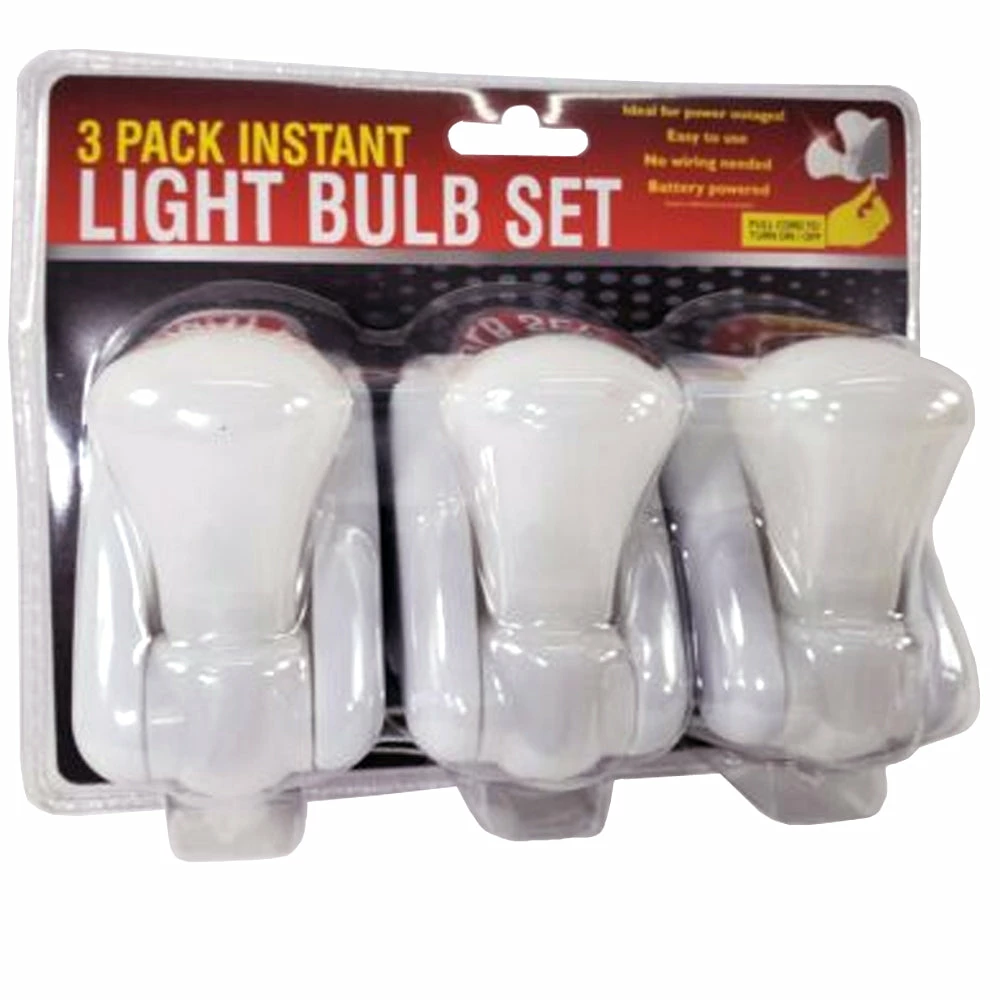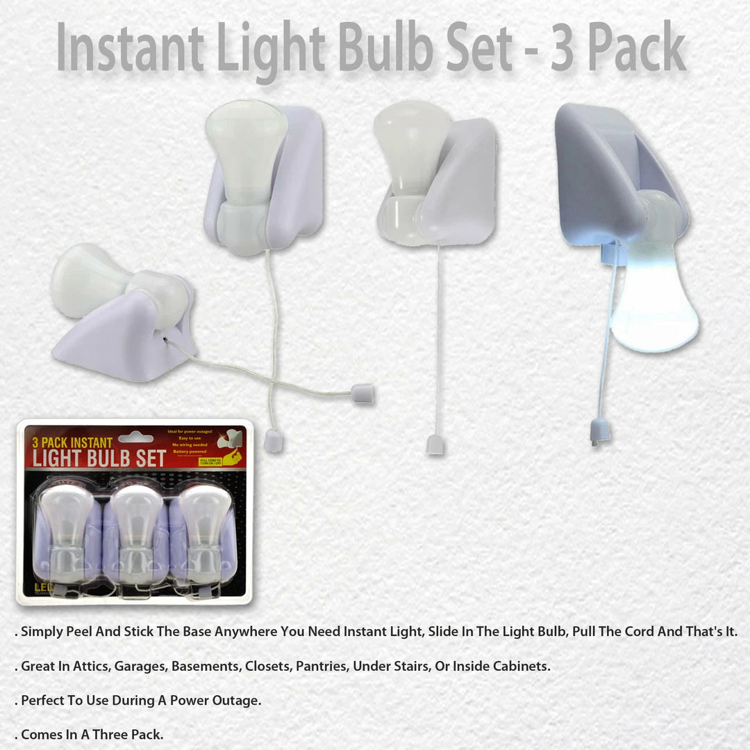 Ideal for power outages and dimly lit areas, this 3-piece Instant LED Light Bulb Set features easy to use, compact light bulbs made of durable plastic in stable bases with self-adhesive mounting squares and cutout mounting holes for more permanent placement. Bulbs are hinged to bases and can be positioned to direct light where you want it. Lights have nylon pull cords to turn them on and off. Each light houses 3 bright LED bulbs and stays cool to the touch. Assembly measures approximately 3″ long x 2.25″ wide. Mounting hardware included.