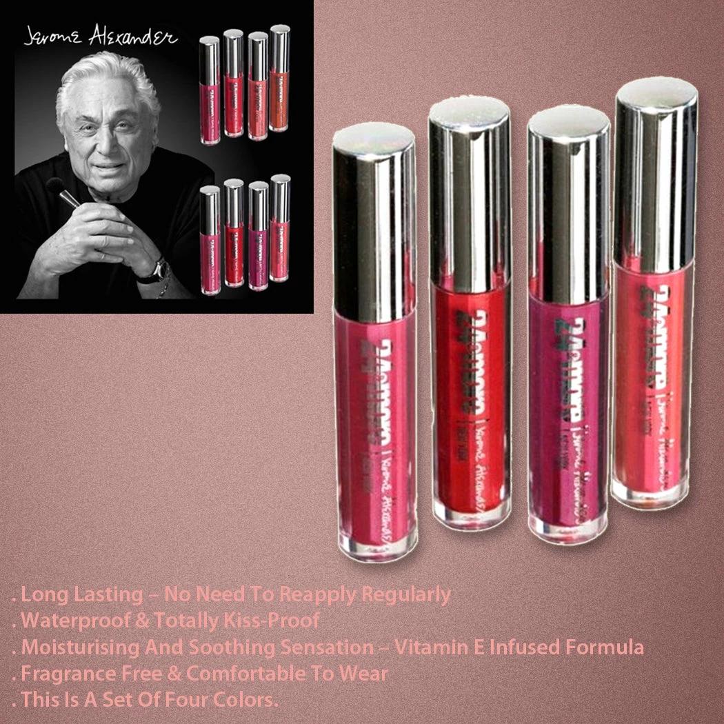 Jerome Alexander 24 & More Lip Color (4 Pack) Rouge Collection Why should round-the-clock gorgeous lips mean endless reapplying? 24&more from Jerome Alexander is the amazing enduring lip color that lasts hour after hour after hour with just a single application. 24&more is totally kiss-proof, and won’t transfer to coffee cups, wine glasses or teeth. It goes on like a lip gloss and stays on like a long-lasting lipstick, delivering complete coverage with no smudging or fading. Lips maintain their ‘just applied’ shine to give you day and night glamour that just doesn’t fade. Includes: 1 x Burgundy Beauty #04 1 x Luscious Rouge #111 1 x Coralicious #104 1 x Passion Purple #102