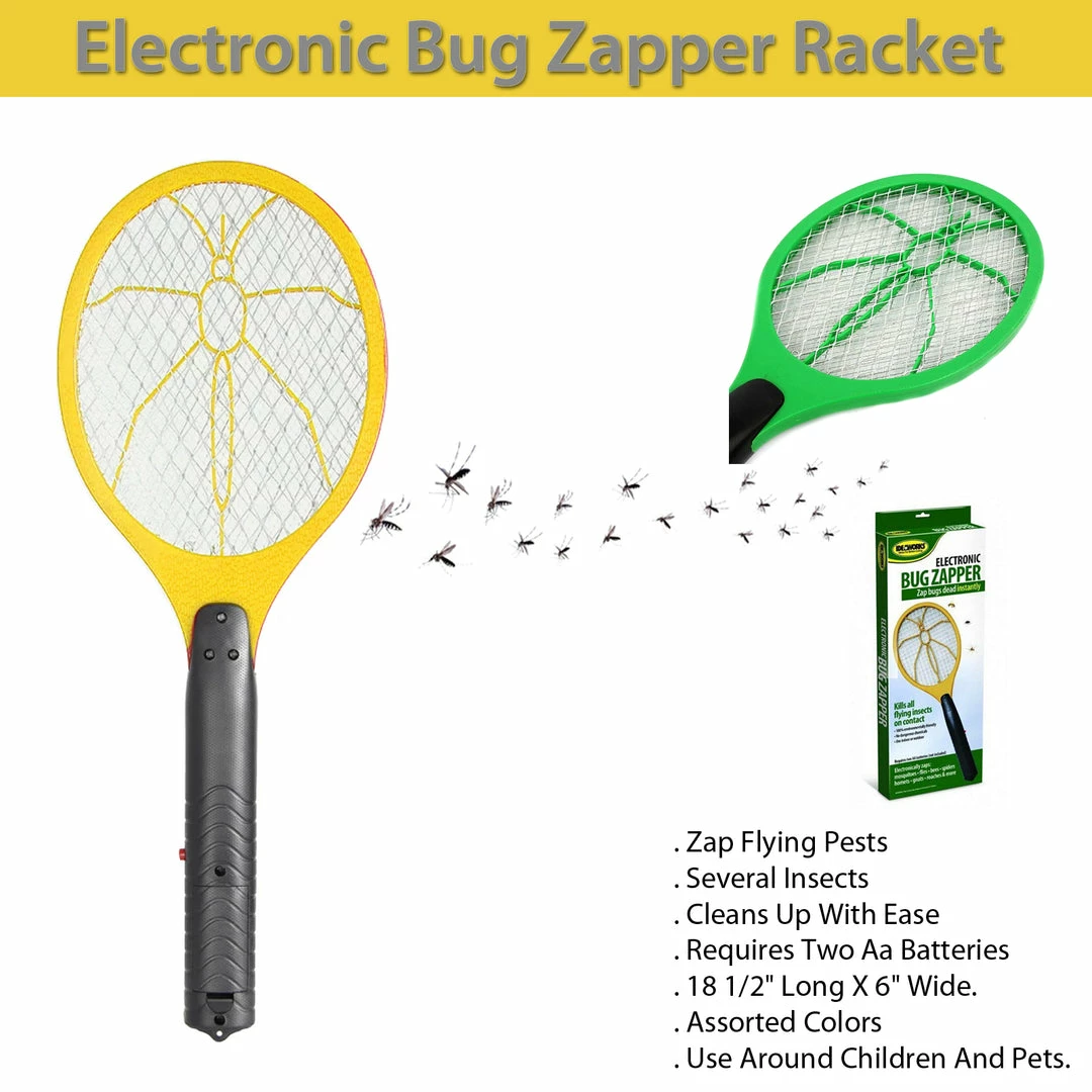 Electronic swatter serves up a punch powerful enough to zap flying pests; yet gentle enough to use around children and pets. Zaps several flies or mosquitoes at the same time. Cleans up with ease. Requires two AA batteries (not included). 18 1/2″ long x 6″ wide. (Assorted Colors May ship)