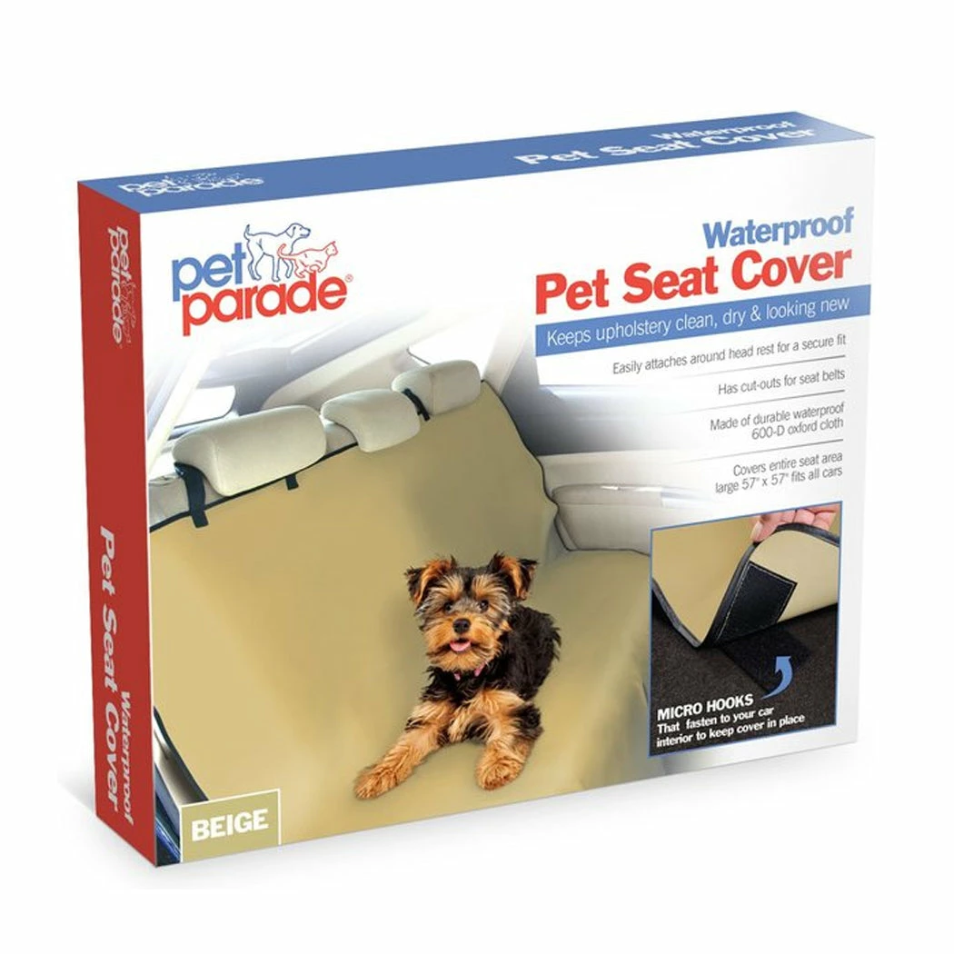 Pet Parade Waterproof Pet Seat Cover The perfect pet lover car seat cover. The durable, oxford cloth waterproof back seat cover extends over the entire rear seat to prevent your pet’s smelly, wet, muddy or grass filled paws, claws and fur from getting all over the clean upholstery. Protects your car’s interior from mud, fur, claws & pet odor. Keeps upholstery clean, dry and looking new. Covers entire seat area. Adjustable straps make it fit all cars. Has Cut-Out so back seat belts can be used. Made of durable waterproof 600D oxford cloth. Large 57″ x 57″. Keeps seat looking new and odor free. Straps adjust to fit all cars. Installs and removes fast. Includes: 1 x Pet Parade Waterproof Pet Seat Cover