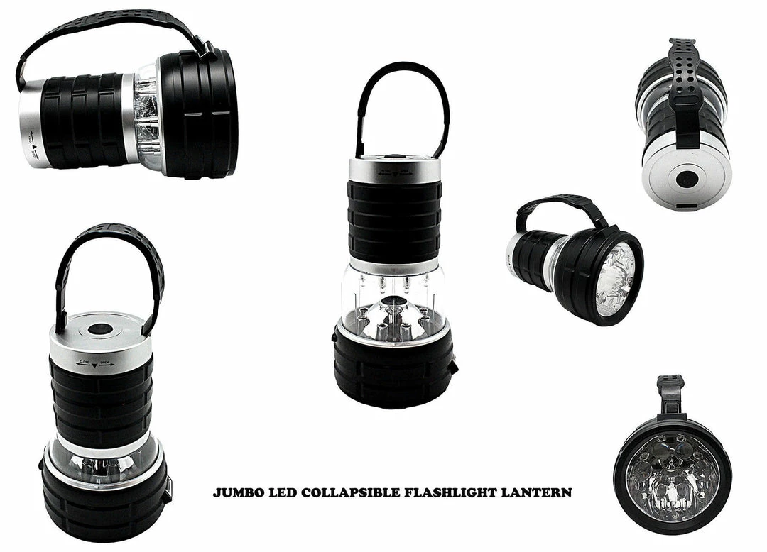 The Jumbo 12 LED Collapsible Flashlight Lantern can be used as a flashlight or a lantern. Easy adjustable strap converts from flashlight to lantern. The flashlight lantern takes 3 D Batteries and has 4 different modes. (all LED off – head 4 LED on – side 8 LED on – all 12 LED on). When collapsing the lantern, make sure it is placed on a sturdy surface. Using the palm of your hand, push and collapse the lantern and use as a flashlight. Pull to use as a lantern.The light is great for Camp, use as a worklight or emergency flashlight. Specifications: Dimensions collapsed: 7.5″(L) x 4.25″(W) x 3″(bottom) x 4.25″(lens). Dimensions extended: 9″(L) x 4.25″(W) x 3″(bottom) x 4.25″(lens).