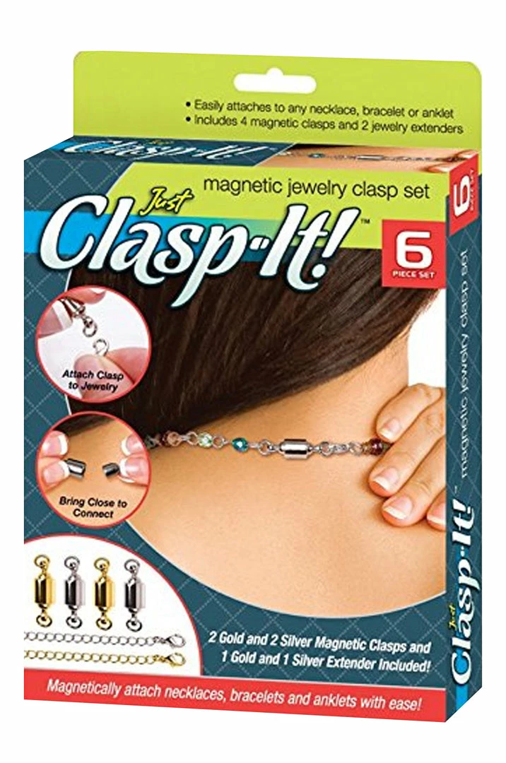 Magnetically attach necklaces, bracelets and anklets with ease! Complete 6 piece clasp and extender set! No more struggling to get awkward hooks and latches to secure your jewelry, just hold the two ends of the clasp close together and the built-in magnet will do the rest. 6 piece set includes : 2 gold magnetic clasps 2 silver magnetic clasps 1 gold extender 1 silver extender. ships in mail order packaging. SHIPS IN MAIL ORDER PACKAGING.