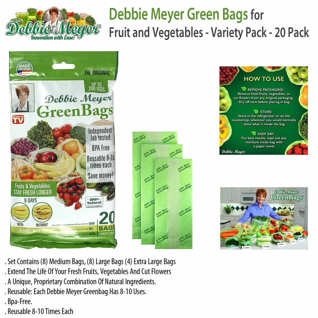 Debbie Meyer GreenBags are made with Debbie Meyer FoodFresh System technology; a unique, proprietary combination of natural ingredients scientifically proven in independent lab testing to prolong the life of fruits, vegetables, and fresh cut flower.When your fresh fruits, vegetables, and cut flowers stay fresh longer, that means you can buy in bulk, throw away less, reduce food waste, and save money. Debbie Meyer GreenBags are reusable 8-10 times each! When your fresh fruits, vegetables, and cut flowers stay fresh longer, that means you can buy in bulk, throw away less, reduce food waste, and save money. Debbie Meyer GreenBags are reusable 8-10 times each! Proven to extend the life of fruits, vegetables and cut flowers. (Lettuce, carrots, celery, bananas, grapes, strawberries, cherries, blueberries, mushrooms, peppers, tomatoes, herbs, fresh cut flowers and so much more)This set contains (8) medium bags, (8) large bags (4) extra large bags