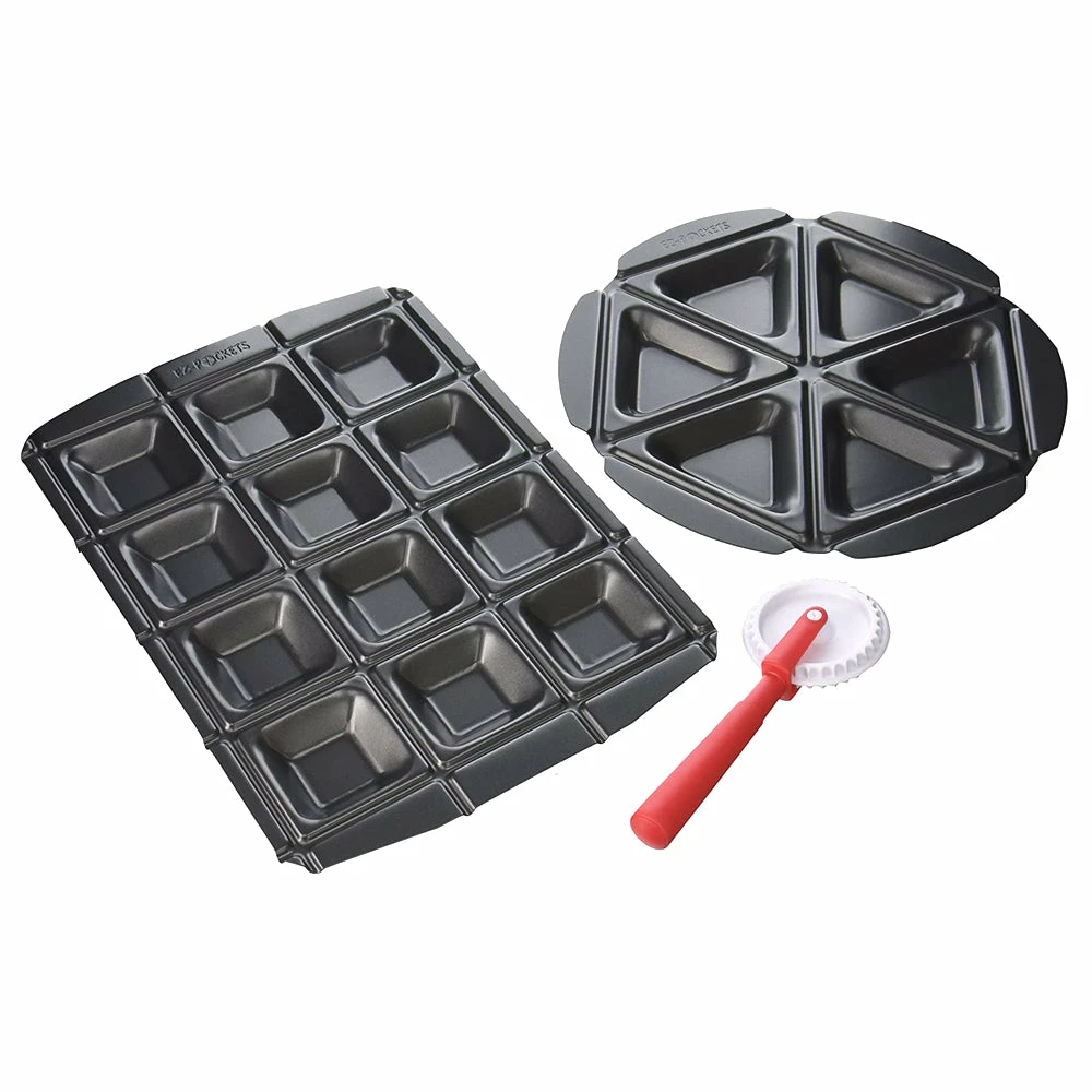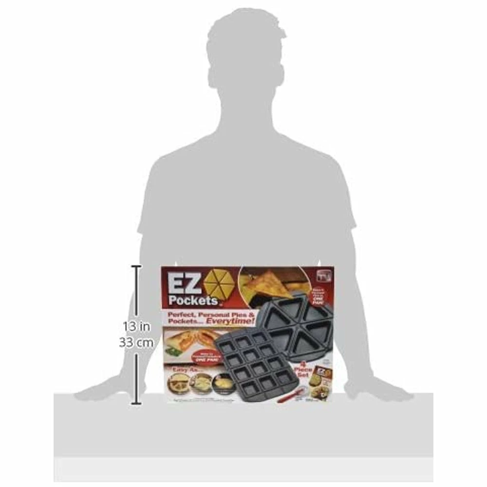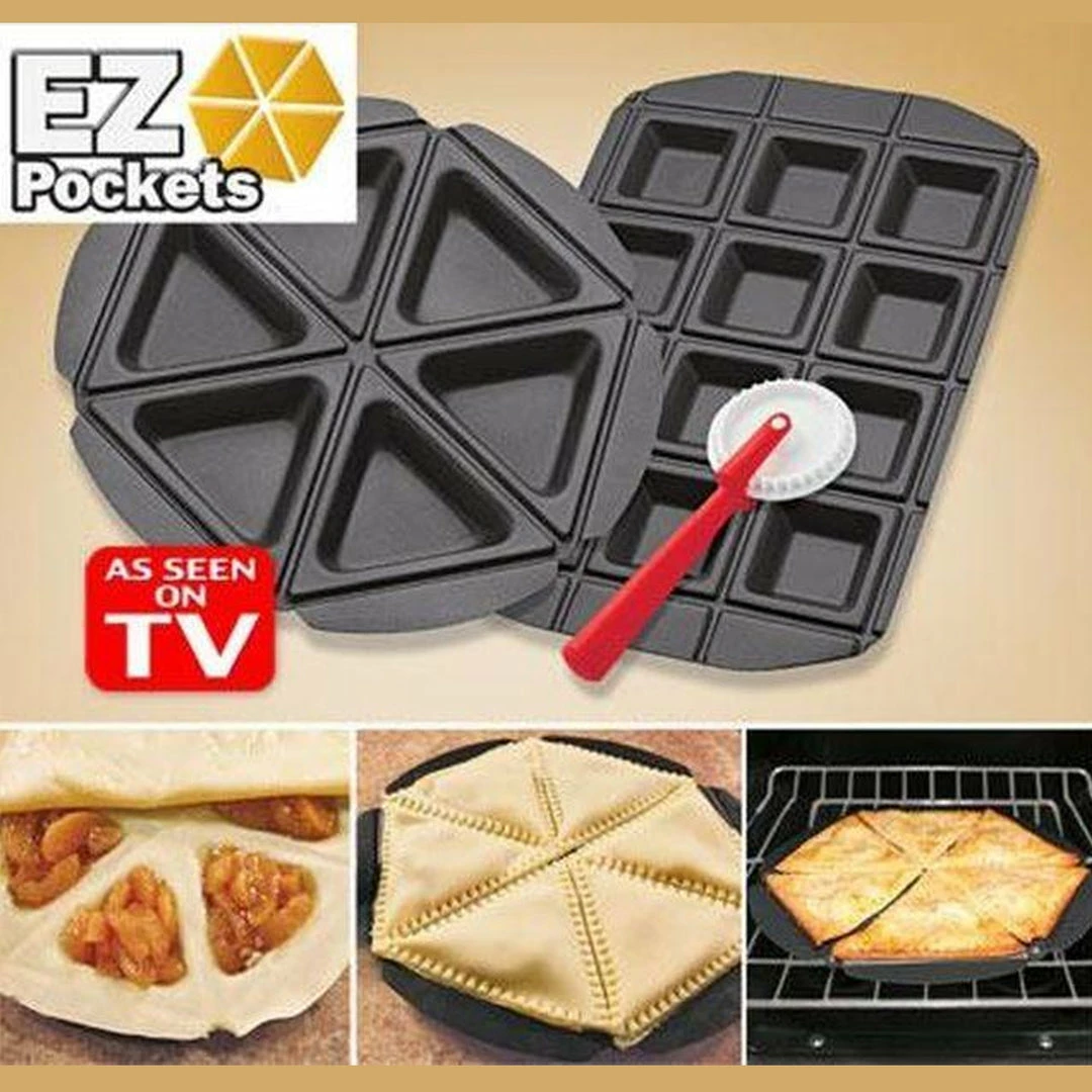 EZ Pockets are as easy as pie. Now you can make individual pie pockets at home. Just place the dough in the EZ Pockets pie pan, fill it with your favorite sweet or savory recipe and then pop it into the oven to bake. You’ll have delicious, personal pies in minutes, perfect for snack time, dessert, kid’s lunches—even dinner. From sweet treats to mealtime favorites, EZ Pockets does it all. The pan’s ridge guides keep the perfect dough cutter in place so you can easily seal, cut and decorate the edges perfectly every time. Not only does EZ Pockets make your favorite dessert pies, it’s perfect for mealtime favorites too. Use the included Deluxe Recipe book to whip up something quick or use your imagination to create all-new flavors. With EZ Pockets, the possibilities are endless. You can even choose a different filling for each pocket–make six different pies, all in one pan. Try making your own calzones, chicken puff pastry pot pies, cheeseburger pocket sliders, spicy taco pocket pies and warm pie a la mode, for examples. Features Perfect for individual servings pocket pies. Make different types of pies at the same time. Great for savory or sweet pies, even pizza pies! Will be a hit at parties! Includes: 1 x 6 Pocket Pan 1 x 12 Pocket Square Pan 1 x Cutting and trimming tool BONUS Recipe Booklet