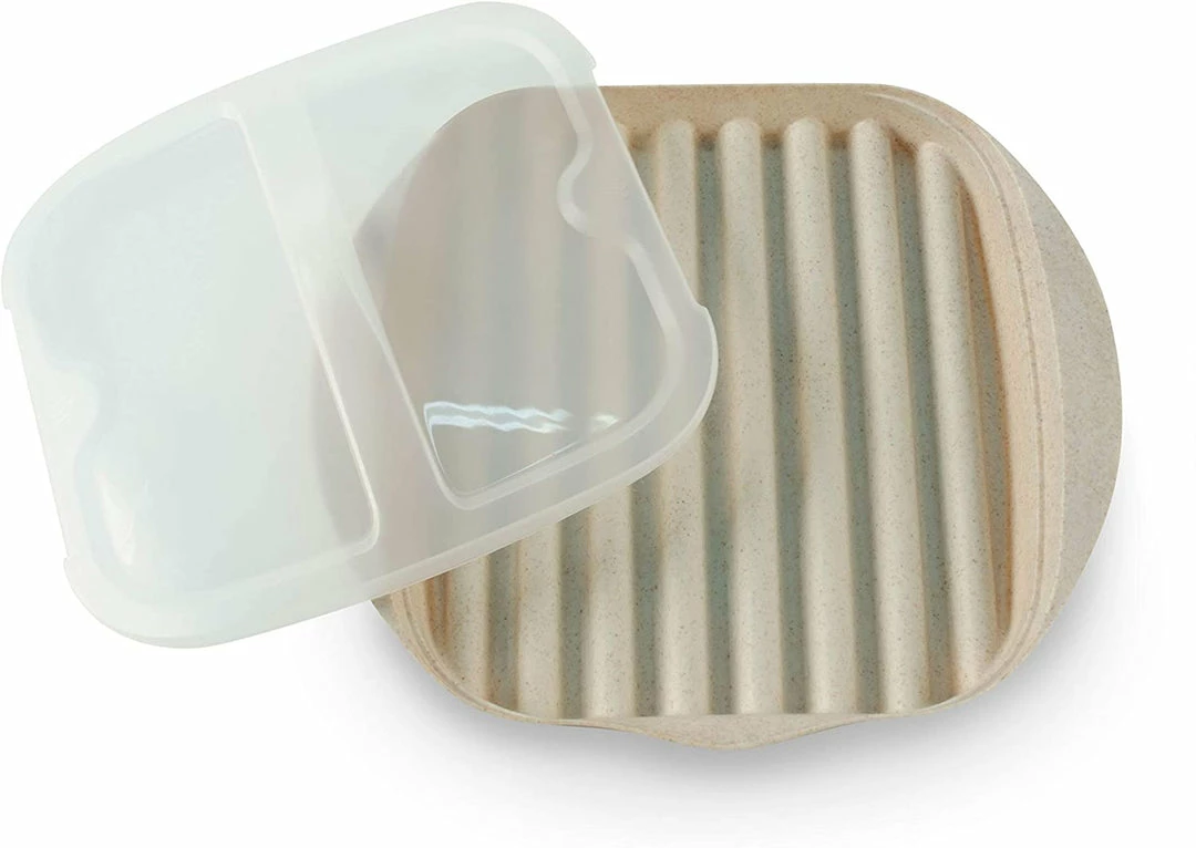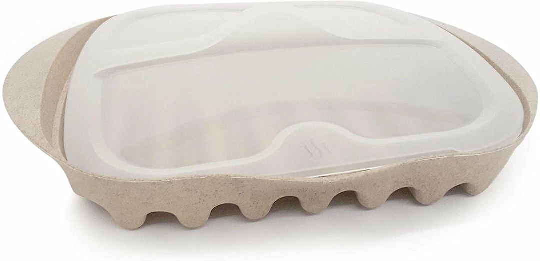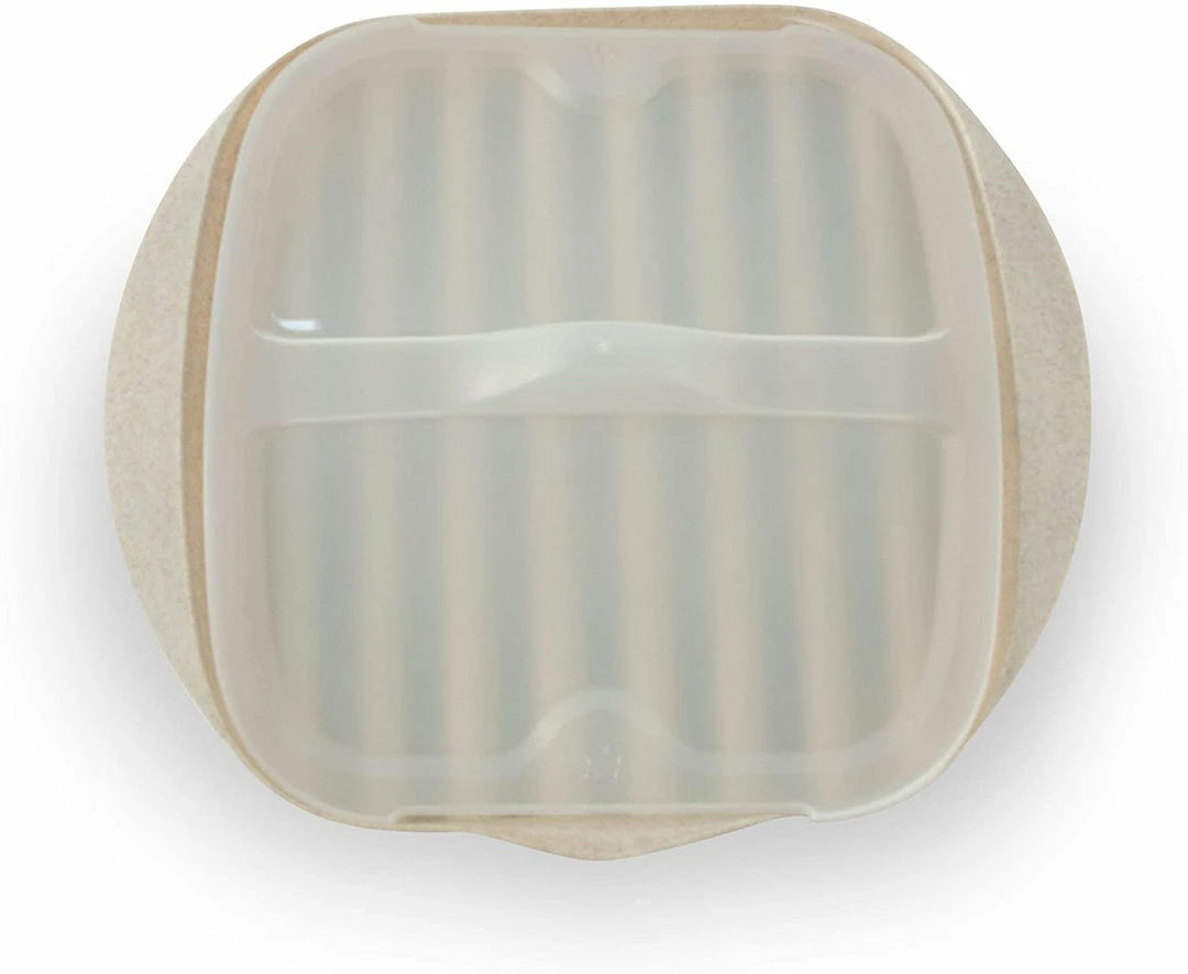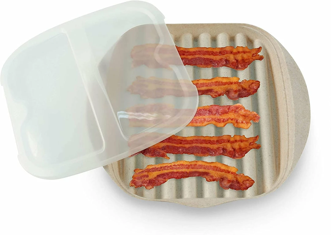 The Handy Gourmet Microwave Bacon Cooker is a microwave-safe tray that drains grease for healthier eating. This multi-use cooker can be used to make bacon, sausage, veggie patties, pizza rolls, and other snacks with more grease or oils. Cooking surface features raised ridges that create an elevated grill-like base for draining excess fat, leaving you with a more healthy breakfast side dish. Included tray cover prevents bacon grease from splattering, helping to keep your kitchen microwave clean. The tray is made with biodegradable and natural wheat straw material and is BPA-free.