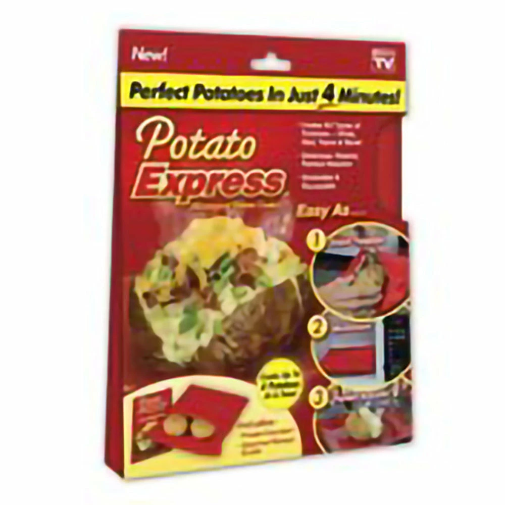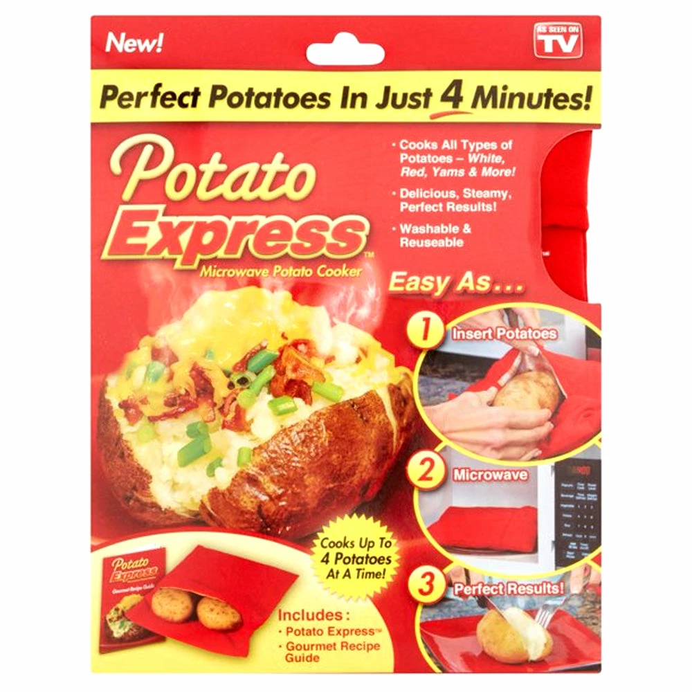 Potato Express Microwave Potato Cooker Perfect potatoes in just 4 minutes! Cooks all types of potatoes- white, red, yams and more. Delicious, steamy perfect results. Washable and reusable. Easy as…1. Insert potatoes 2. Microwave and 3. Perfect results. Cooks up to 4 potatoes at a time! Includes: 1 x Potato Express Microwave Potato Cooker 1 x Gourmet Recipe Guide Potato or Veggie Express will ship, the products are the same and only differ in color.