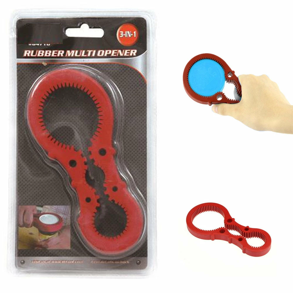 Rubber multi opener twists off caps and lids in one motion. The unique opener is 3 flexible ribbed openers in one for soda bottles, condiments, pasta sauces, home-canned goods.