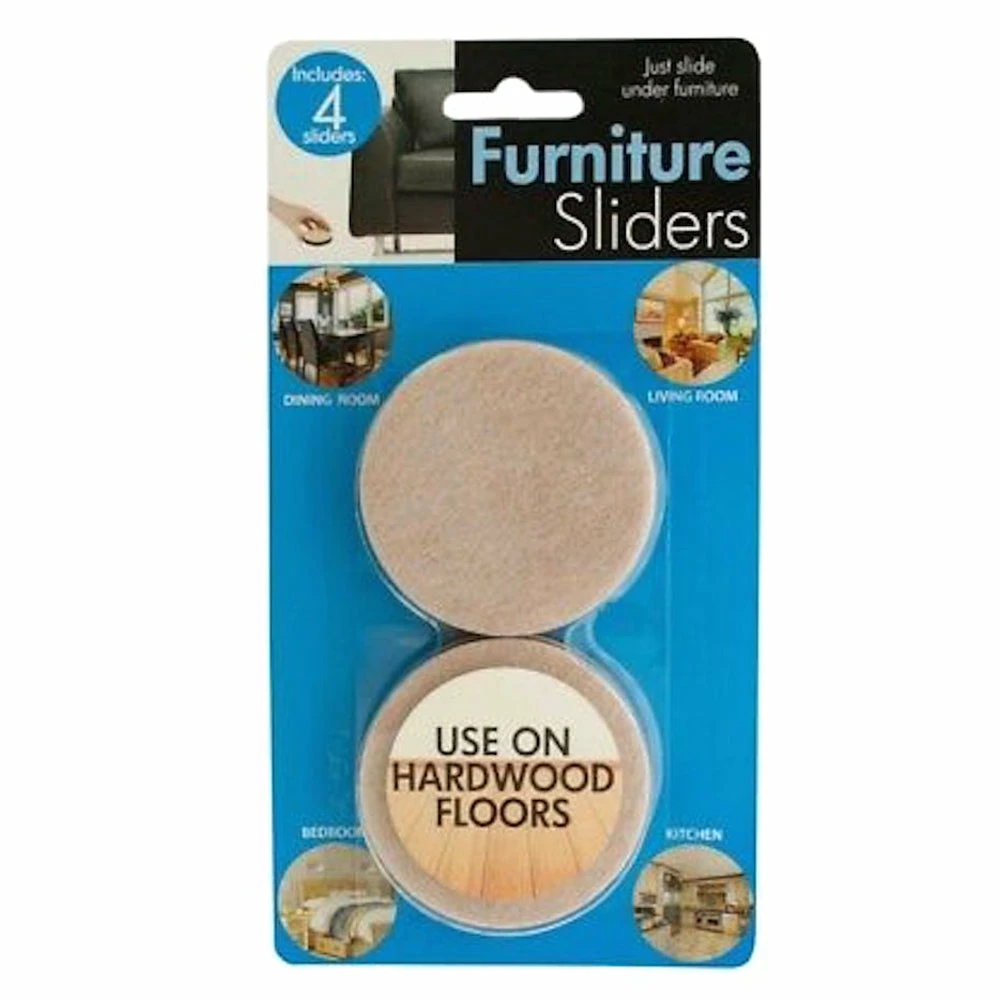 Protect floors from scratches and damage with this 4-piece Large Furniture Sliders Set featuring round layered felt and foam sliders that work on carpet and tiles and make moving heavy objects easy. Each slider measures approximately 2.5″ in diameter.