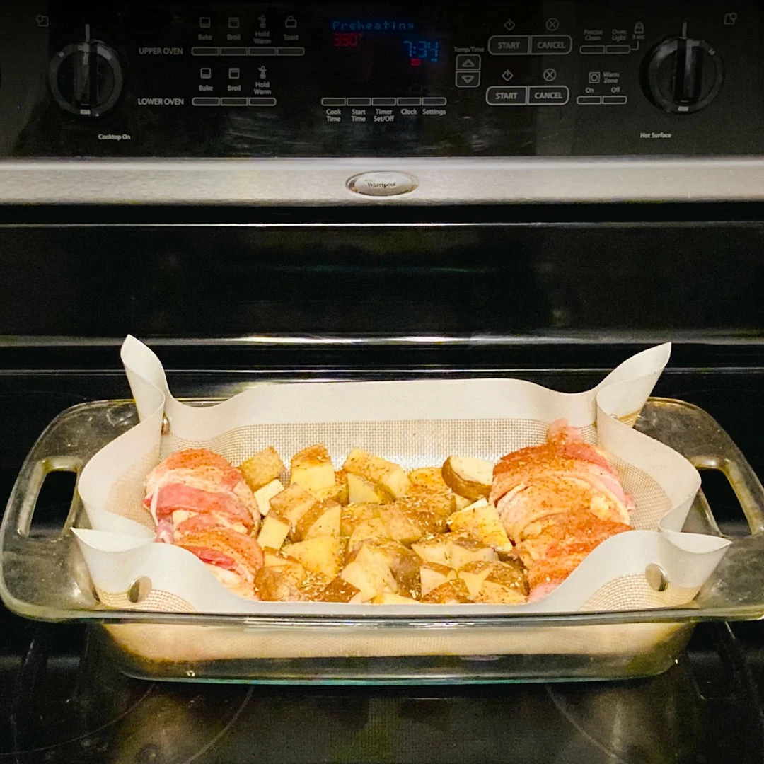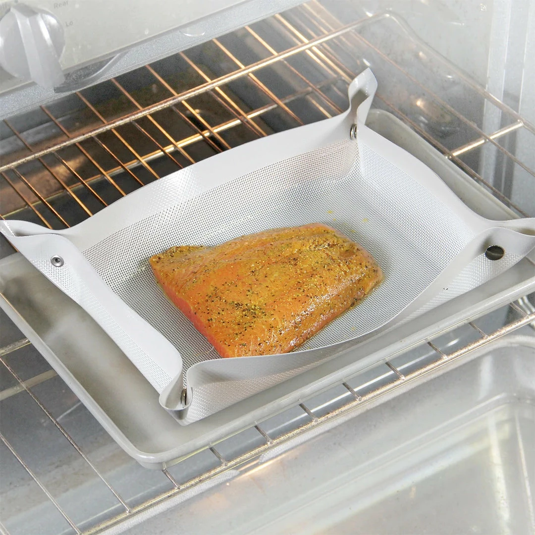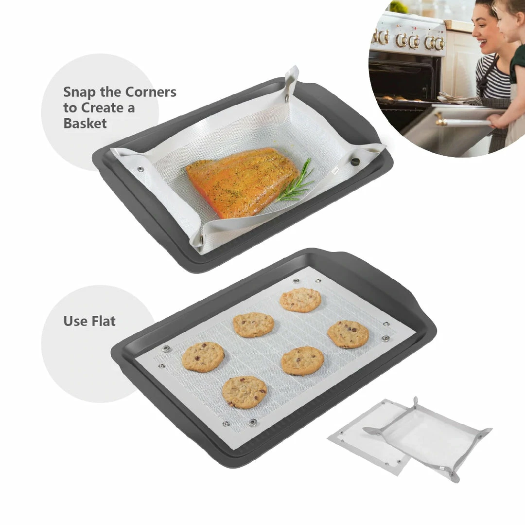 FIRST EVER BAKING LINER THAT TURNS INTO A RIMMED TRAY. Just snap the corners together to create a leak and spill proof lip that will catch oil and other liquids keeping your oven clean and mess free. OVEN SAFE TO 450 DEGREES FAHRENHEIT. This mat was built to last. Perfect for cookies, bread, pastries, pizza, wings and anything else you love to cook or bake at home. Super easy to clean when done