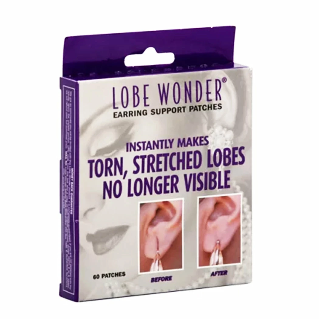 Lobe Wonder Ear Lobe Support Patches Lobe Wonder Support Patches work to repair the appearance of torn, damaged and stretched ear lobes instantly! Worn behind your ear lobe, these invisible patches are the perfect remedy to the problem of heavy pierced earrings tearing and s-t-r-e-t-c-hing your ear lobes. Each self adhesive oval patch is super-reinforced with a criss-cross network to strengthen and support ear lobes. Your ear lobes will look natural, not stretched and dragged down by the weight of heavy earrings. Lobe Wonder patches are “breathable” and the special medical adhesive doesn’t irritate the skin. With Lobe Wonder, you’ll be able to wear your chandelier earrings, hoops and favorite studs. And the best part? No more worry about tearing and stretching!