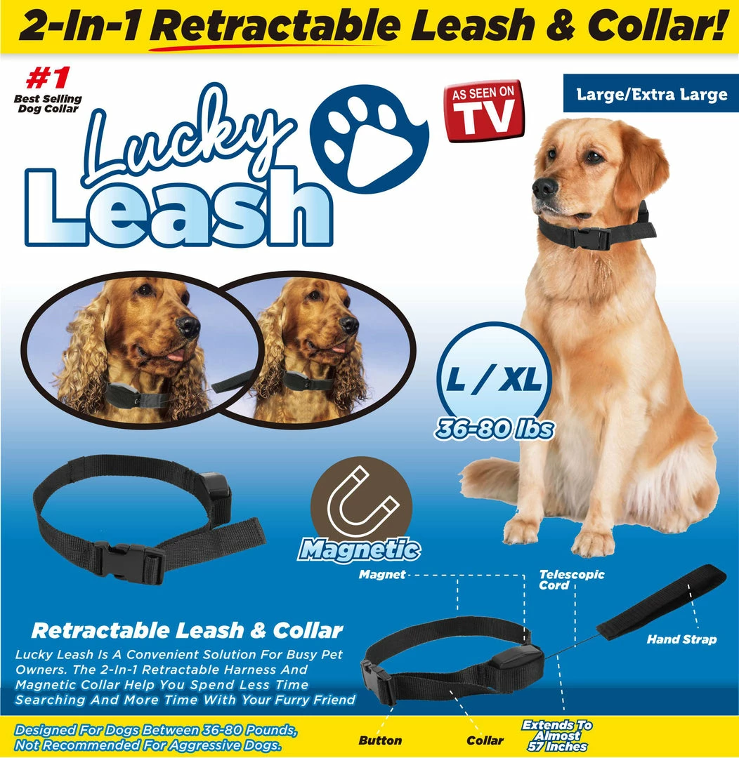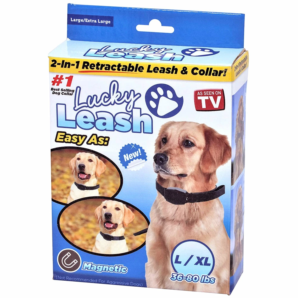 Stop searching for a leash when you want to walk your dog! This cleverly designed collar has an attached, retractable leash to make walking your dog simple and safe. The telescopic cord extends up to 57″ and retracts into the collar when not in use. The hand strap magnetically attaches to the collar when not needed. Available in 2 sizes. Plastic and polyester. Size available in S/M fits dogs 10-35 lbs. or L/XL fits dogs 36-80 lbs.