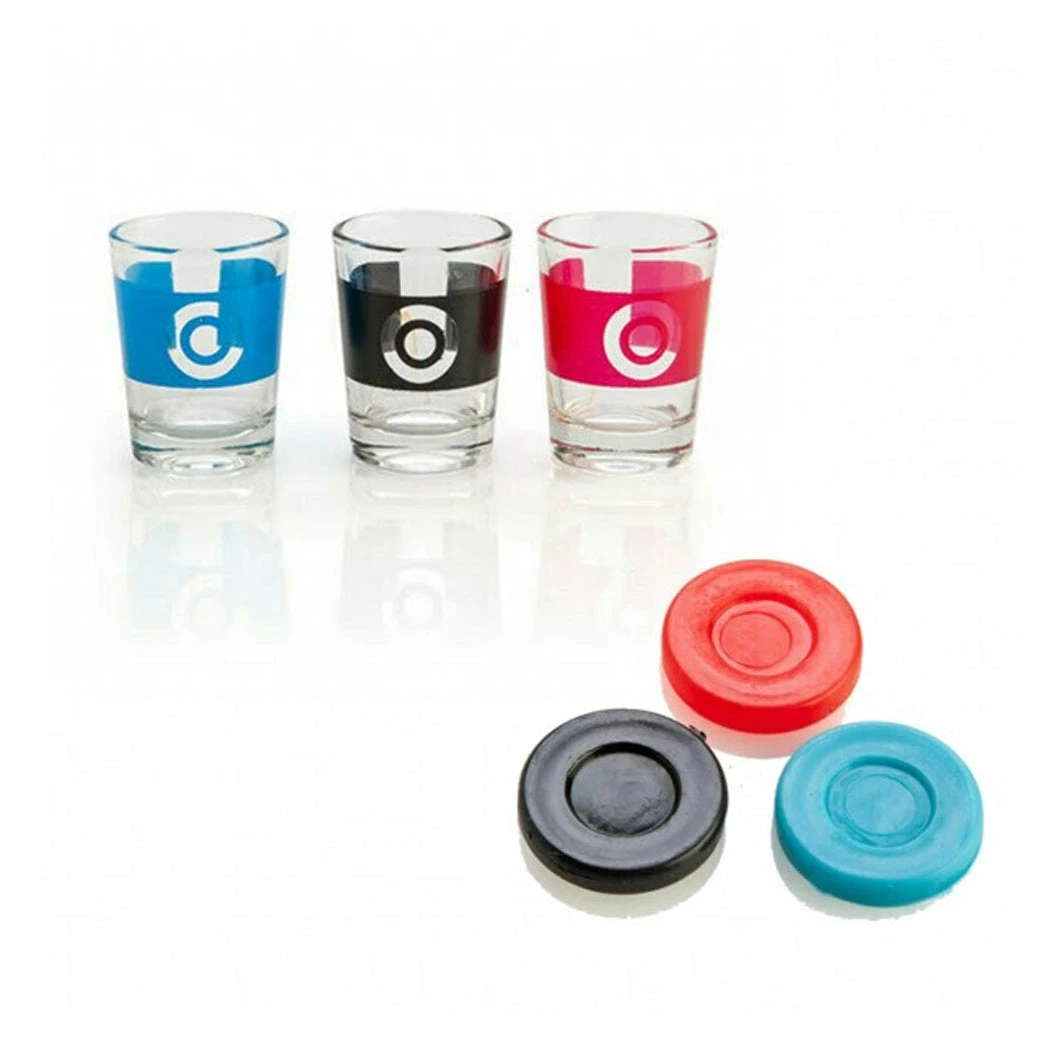Fill the glasses with different substances and test your luck Simply drop a token into the slot board and drink the shot your token fell behind. Includes 1 slot board & 3 chips and 3 different colored shot glasses.