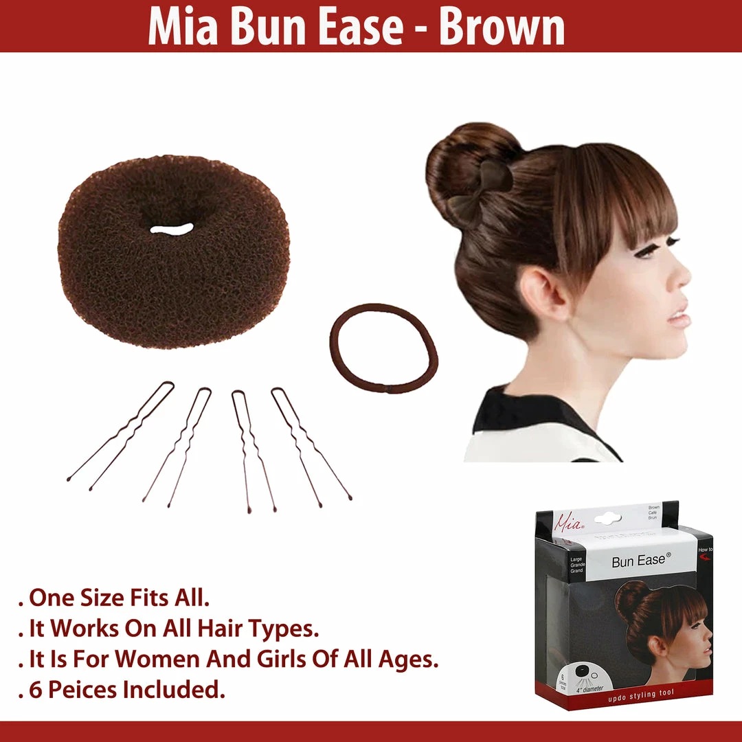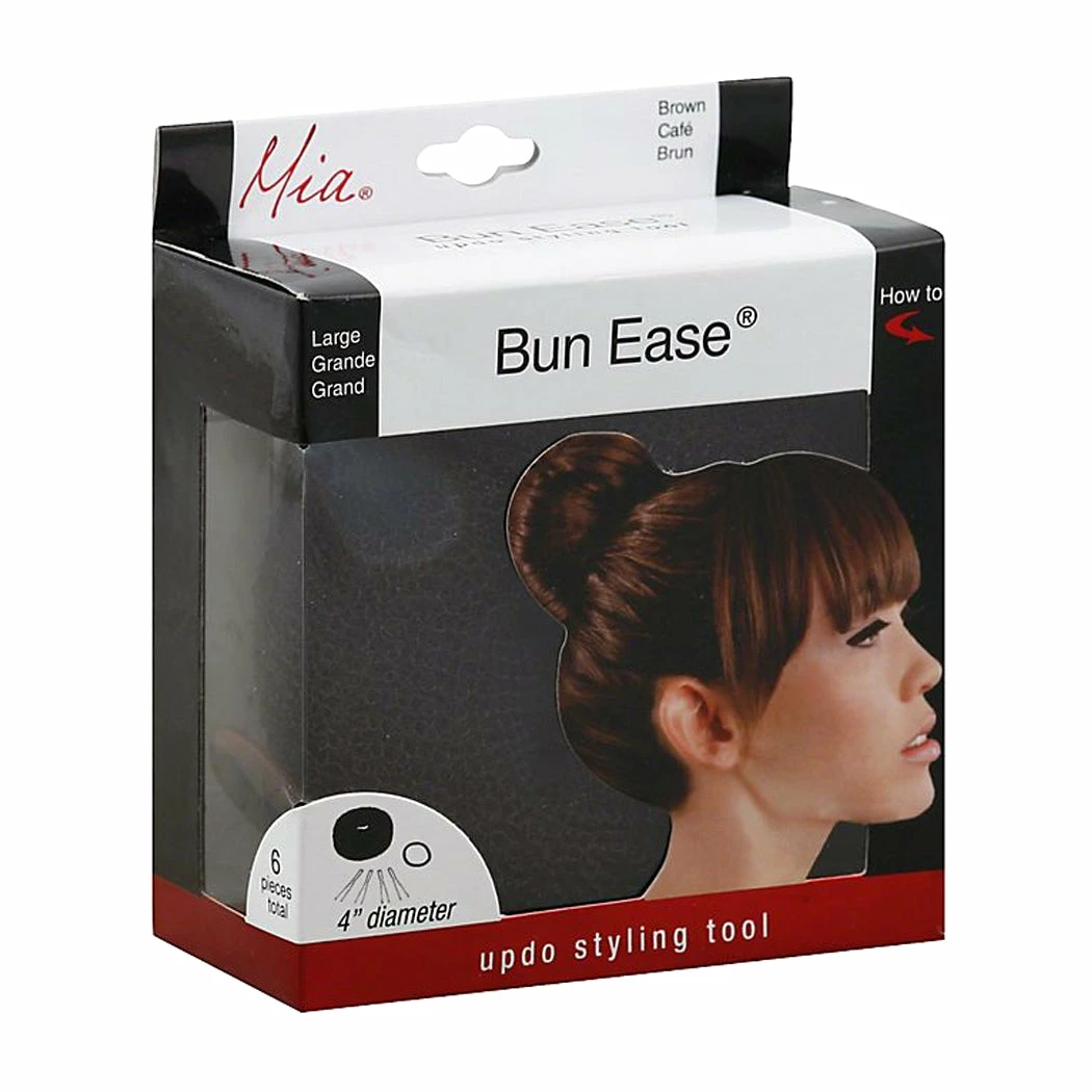 Achieve a beautiful bun in seconds with the Bun Ease updo styling tool. The Bun Ease is quick and easy to use on all hair types. Unroll Bun Ease, then tuck and roll into hair. It is that easy. 1 styling tool, 4 Mia hair pins, and 1 Mia metal-free brown rubber band included. If Bun Ease is too large, you may unroll the material and trim the Bun Ease to shorten it and make it less bulky. Trim carefully. Other colors (blonde, brown, and black) and sizes (small, medium, large and extra large) are available by Mia Beauty and Mosaic Brands Inc. One size fits all. It works on all hair types. It is for women and girls of all ages. 6 peices included.