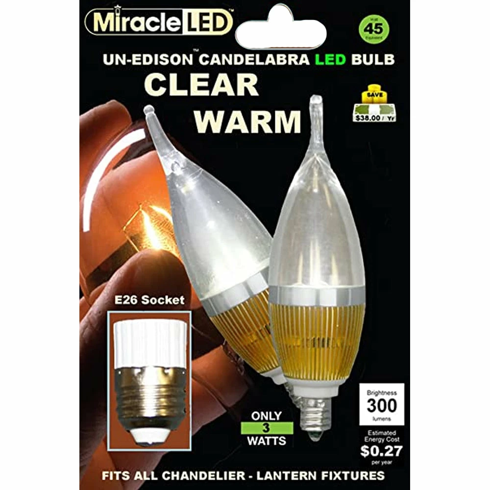 Miracle LED Un-Edison Clear Warm Candelabra Bulb w/ Adapter Ideal indoor/outdoor decorative lighting. The Miracle LED is the latest technological innovation in lighting. It produces the highest lumen output at the lowest wattage. The Miracle LED clear warm candelabra perfectly replaces all old standard decorator bulbs yet are packed with efficiency. Replaces 45W equivalent bulbs, and uses only 3 watts of power and offers 300 brightness Lumens. Fits all chandelier-lantern fixtures and includes an E26 socket adapter. Features: Nearly zero heat output Equivalent to standard 45w bulbs Costs $0.27 per year with an average savings of $38.00 per year Lasts 600% longer than standard bulbs 30,000+ estimated life hours Uses only 3 Watts of power 300 Lumens Includes: 1 x Miracle LED Un-Edison Clear Warm Candelabra Bulb w/ Adapter