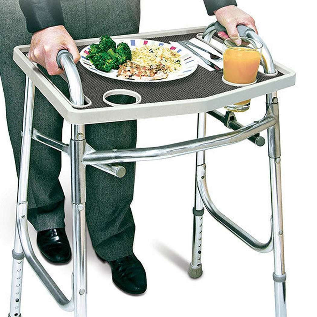 Makes carrying dinner, magazines and crafts easy. Turns any standard walker into a TV/transport tray. Two recessed cup holders secure beverages. Raised edges prevent spills. Walker tray has non-slip grip