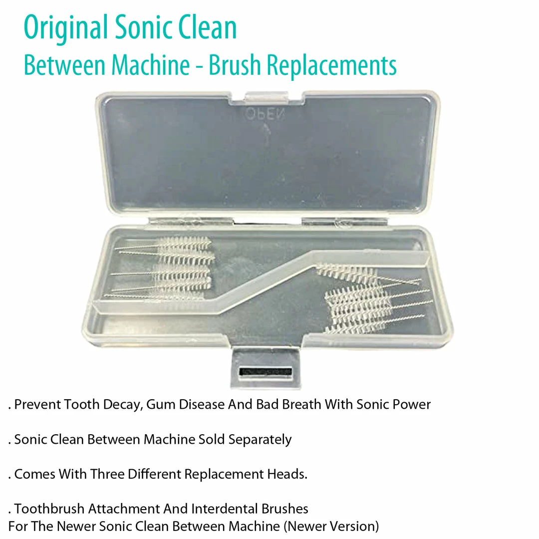 Brush Replacements for Newer Model Sonic Clean Between Machine Toothbrush Attachment and interdental brushes for the Newer Sonic Clean Between Machine (newer version) Includes: 1 x Sonic toothbrush attachment – soft and compact, this toothbrush is the perfect size for any mouth 10 x Sonic interdental brushes with patented clicktip in a cassette case- designed by a dentist to a clean inbetween teeth where flossing cannot reach Item comes in mail order packaging Sonic Clean Between Machine SOLD SEPARATELY. *Please note that this is for the Newer (newer model) Sonic Clean Between Machine. Replacement brushes for the older original version are available in another listing