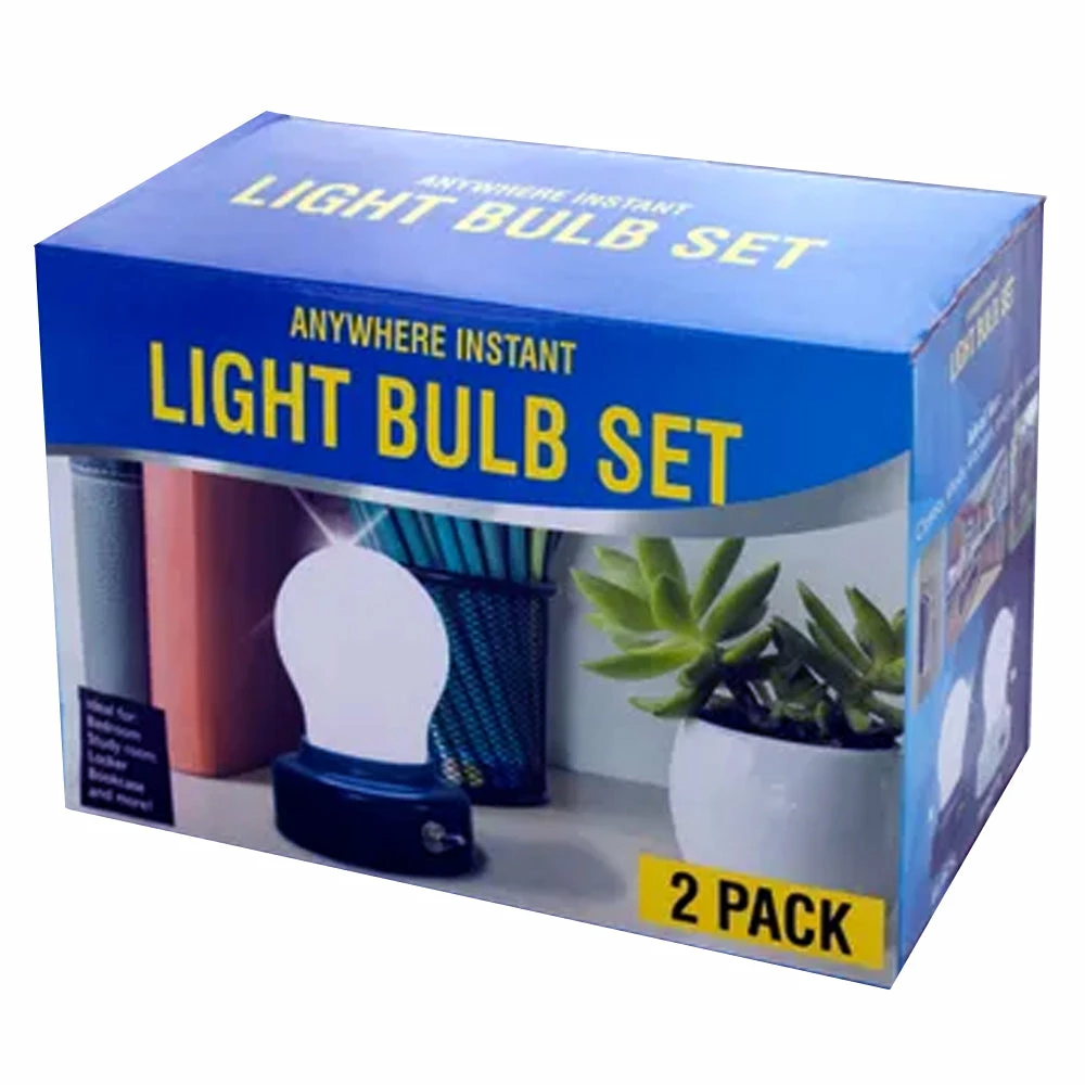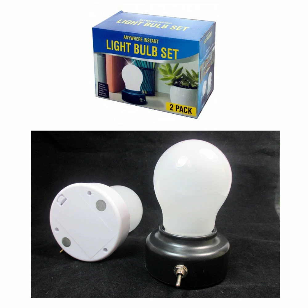 Easily illuminate any location with this convenient 2-piece LED Anywhere Instant Light Bulb Set featuring shatter-proof, cool to touch light bulbs made of durable plastic with strong magnetic bases. Bulbs sit in round bases and turn on and off with metal switches. No wiring required. Bulbs measure approximately 4.3″ tall. Each bulb requires 3 ‘AAA’ batteries (not included). Comes with 1 black and 1 white based bulb.