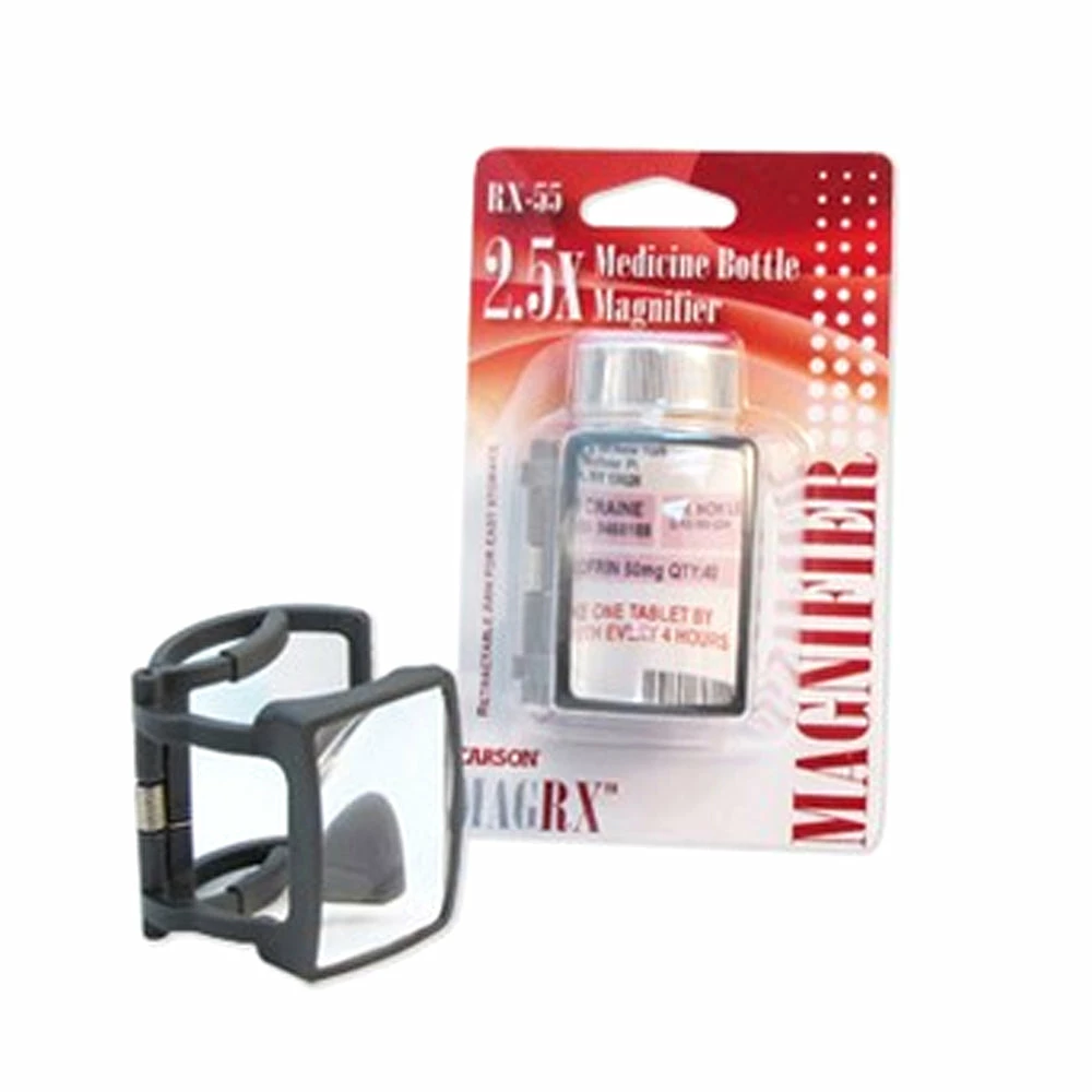 The Carson MagRX is a 2.5x power clip-on magnifier designed to fit on most standard prescription medicine bottles. Simply clip the MagRX to a prescription bottle and swing the magnifying lens outward to magnify text. The 2.5x power magnification will help avoid mistakes in reading vital dosage or instructional information listed in difficult to read fine print. Fold the magnifying lens on the MagRX inward against bottle when not in use for compact, easy storage. At Carson, we strive to make sure our customers are 100% satisfied with the quality of our magnifiers. We are so confident in our magnifiers that we back them with a Lifetime Limited Warranty! Carson will repair or replace your magnifier if it is found to have manufacturing defects in materials or workmanship. Please contact Carson for additional warranty details.