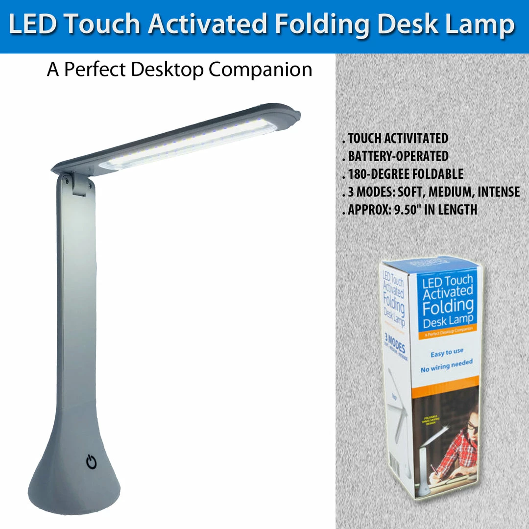 LED Technology – LED touch Activitated Folding Desk Lamp is perfect for your desktop, nightstand, or working area. The battery-operated desk lamp is easy to use and needs no wiring. It features a 180-degree foldable space-saving design and touch sensitive button with dimmer control of 3 Modes – soft, medium, intense. It requires 3 AA batteries (not included) and comes packaged in a box. The light is approximately 9.50″ in length when compacted.
