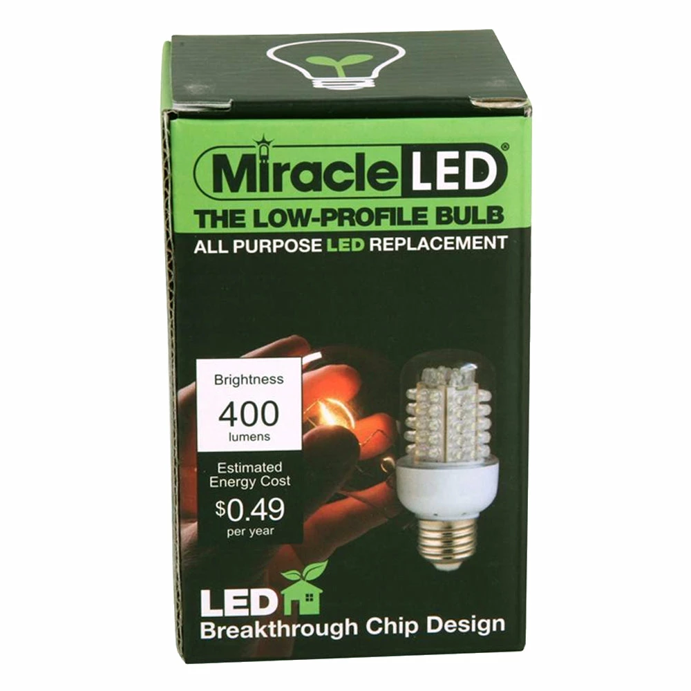 MiracleLED 5W Un Edison General Purpose/ Lamp/ Low Profile Bulb Replaces 50W bulbs – 40 watt equivalent bulb uses 5 watts of power – Lasts up to 25 times longer than incandescent bulbs – costs 8 to 11 cents per 1000 hours of illumination – Recommended replacement for standard E26 & E27 – 120 VAC – SAFE – no Hazardous materials such as mercury – 30,000+ estimated life hours – Durable – doesn’t break easily – One year warranty