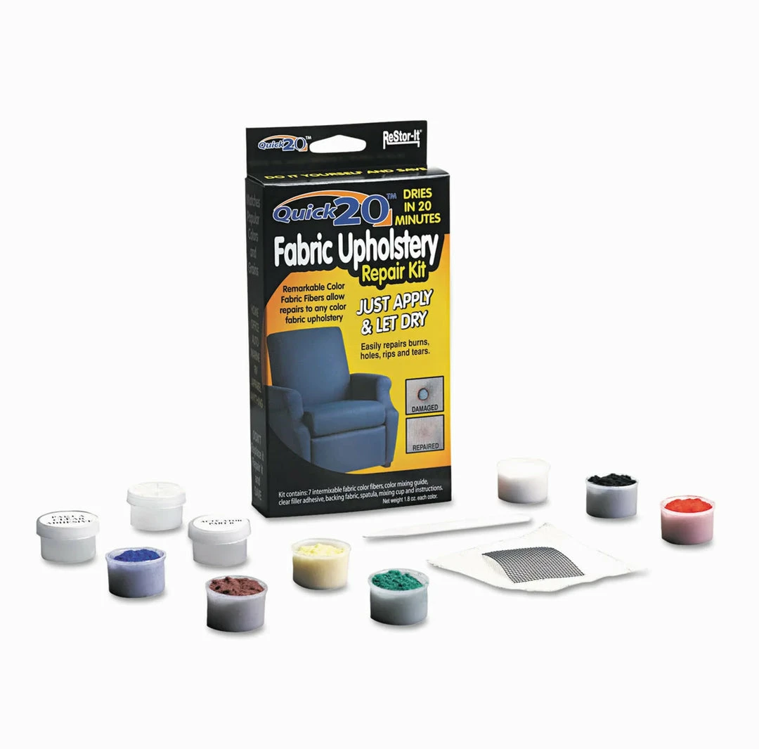 Quick 20 Fabric Upholstery Repair Kit contains remarkable color fabric fibers that repair any color fabric upholstery. Dries in 20 minutes. Kit contains seven 1.8-ounce colors, mixing guide, mixing cup, applicator and easy to follow instructions. Matches popular colors and grains. You can repair: Carpet Draperies Rugs Clothing Purses Bedding Sofas Chairs Car interiors Luggage Fabric