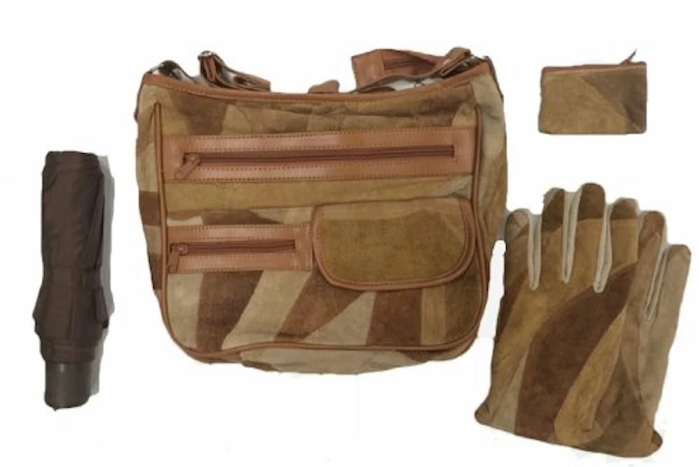 Patchwork Suede Shoulder Bag Set w/ Gloves, Umbrella and Coin Purse A fabulous 4 piece set! Shoulder bag has special compartment for umbrella storage! This suede patchwork shoulder bag features two spacious, fully lined main zip compartments, one inside zip pocket, three outside front zip pockets and one outside back zip pocket to keep your necessities secure. Adjustable shoulder strap with 14″-26″ drop. Measures approximately 9 1/4″H x 12″W x 4 1/2″D Includes: 1 x Patchwork suede shoulder bag 1 x Coin purse 1 x Umbrella 1 x Pair of Suede Gloves
