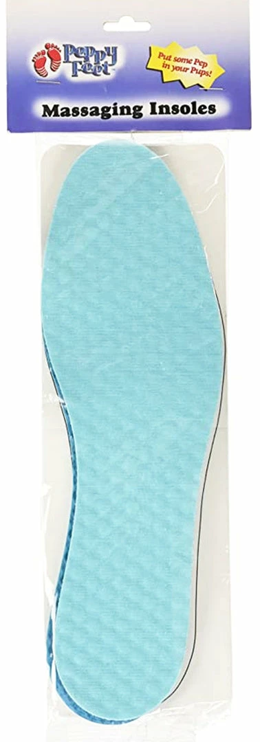 Peppy Feet Massaging Insoles Put some pep in your step! With over 300 massage tips per insole micro acupressure points stimulate the soles of your feet to help increase blood circulation. Invigorate tired and sore feet. Latex foam gives your feet extra cushion for shock absorption. Peppy Feet Massaging Insoles are scented with Peppermint and Lemongrass aroma therapy. To cool, soothe, freshen feet, reduce odor. Cut to desired size