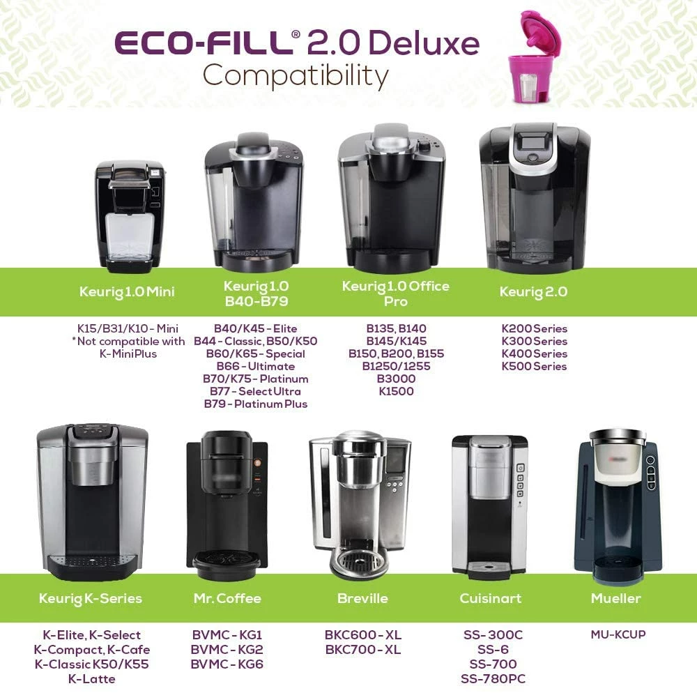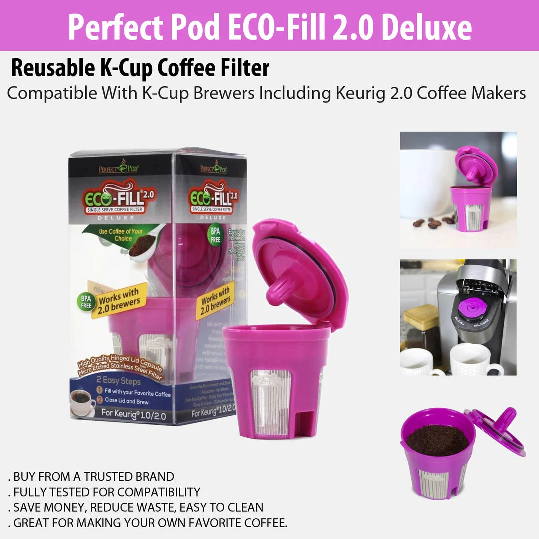 The ECO-Fill 2.0 Deluxe refillable and reusable coffee pod capsule lets you choose between really expensive, prefilled coffee pods or the more affordable option of refilling your very own favorite coffee blend of your choice. They’re a great option for use with Keurig 1.0/2.0, Office Pro, K-Series, and select models from coffee makers such as Breville, Cuisinart, Mr. Coffee, and Mueller Austria. You can use them with or without Perfect Pod’s disposable paper coffee filters for Keurig K-Cup single-serve coffee brewers. There’s no need to remove your brewer’s K-Cup holder – just fill the capsule, insert it in the holder, and hit brew!