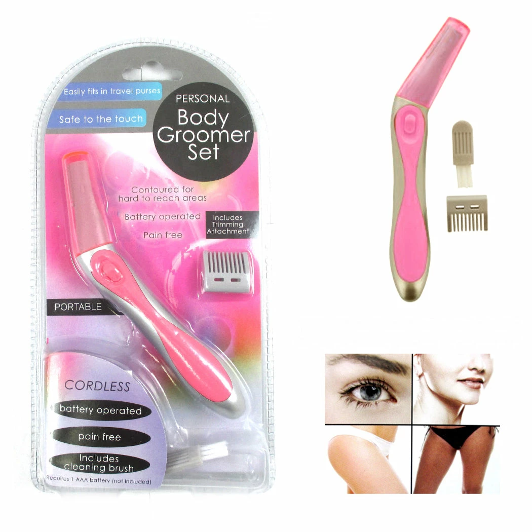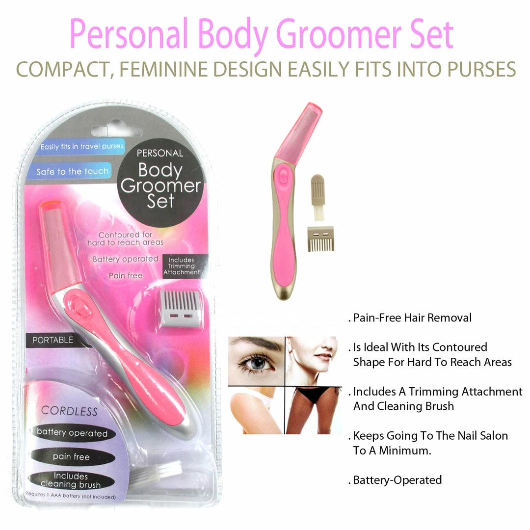 For gentle, pain-free hair removal, this Battery-Operated Personal Body Groomer Set is ideal with its contoured shape for hard to reach areas. Compact, feminine design easily fits into purses. Includes a trimming attachment and cleaning brush. Measures approximately 5.5″ long. Requires one ‘AAA’ battery (not included). Comes packaged in a clam shell.