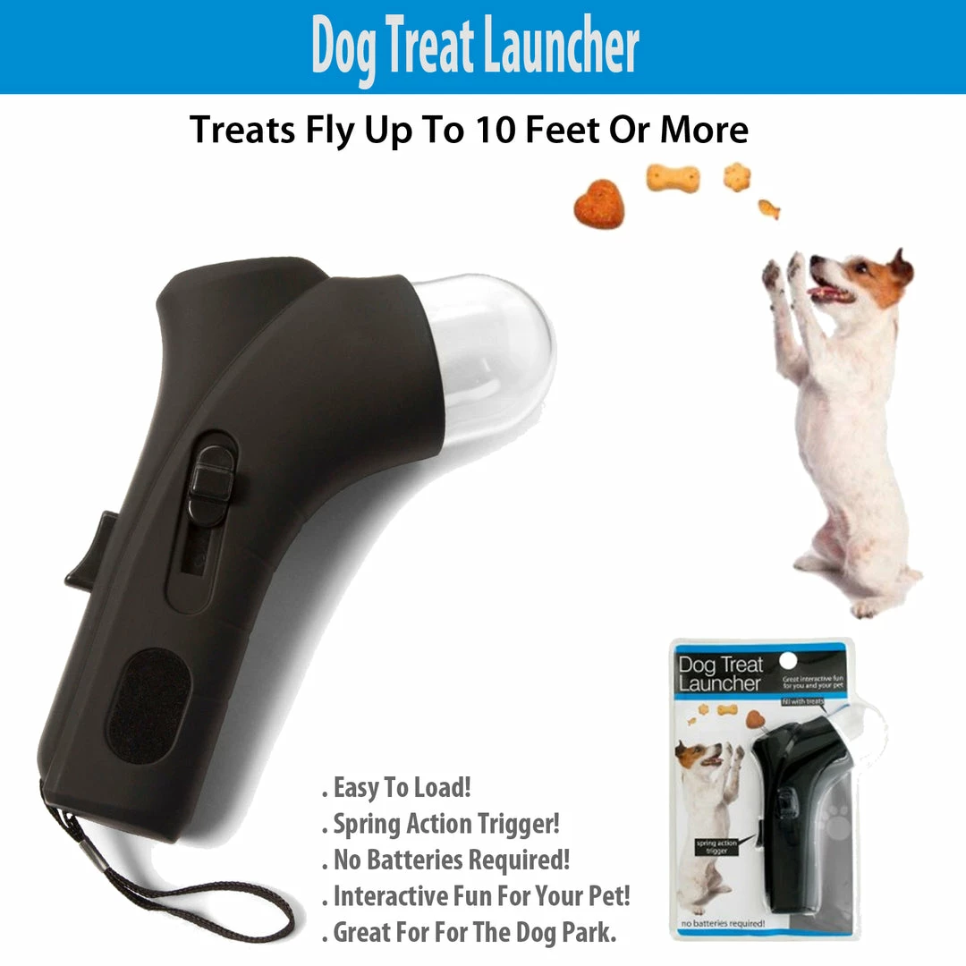 For great interactive fun for you and your pet, fill this easy to load Dog Treat Launcher with treats, squeeze the spring action trigger and watch the treats fly up to 10 feet or more. No batteries required. ( Measures approximately 7″ x 4.25″.)