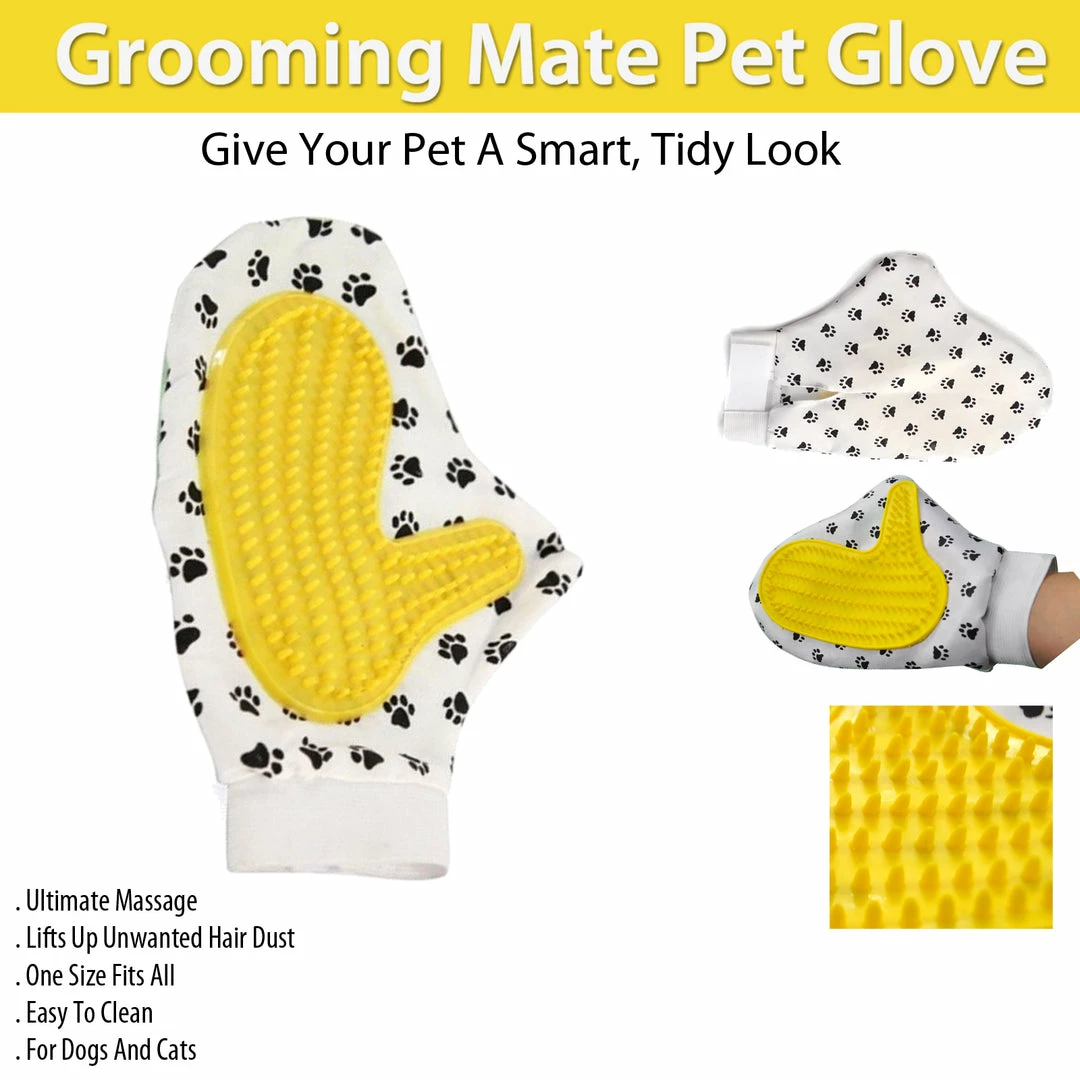 PET FAVORITE GROOM GLOVE Give your pet a smart, tidy look. Gromming Mate is your pets favorite friend. No pet can resist its feeling. Grooming Mate gives an ultimate massage and lifts up all the unwanted hair and dust. One size fits all. Easy to clean with no fuss or mess.