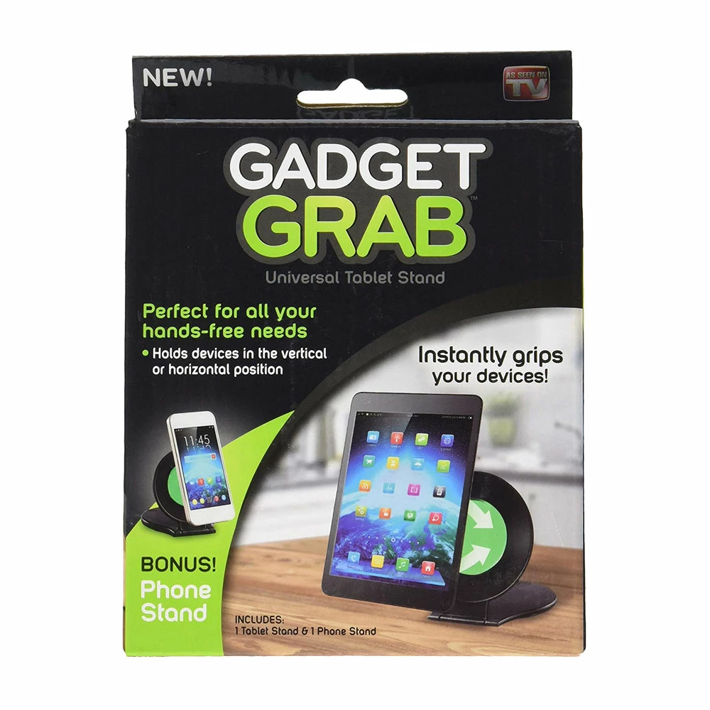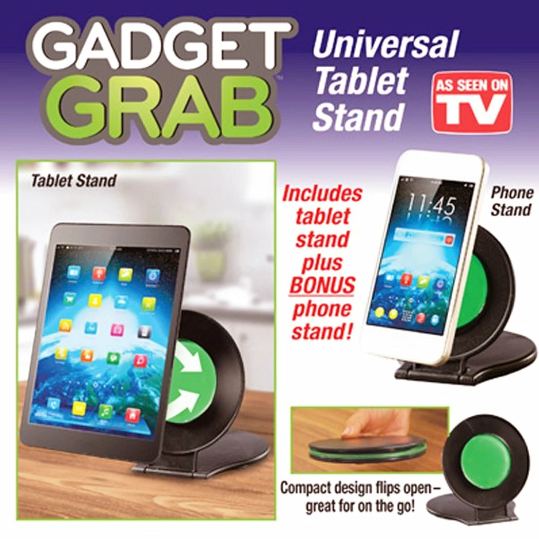 Gadget GrabTM Get the perfect viewing angle every time with this universal tablet and phone stand. Just flip it, stick it, and stand it for hands-free viewing. Great for reading, watching movies, and even video calls or use while cooking. It is constructed with a unique polymer surface that grips onto your tablet or phone without leaving behind any sticky residue. The compact folding design makes it great for travel and can be easily stored when not used. Holds devices horizontally or vertically.