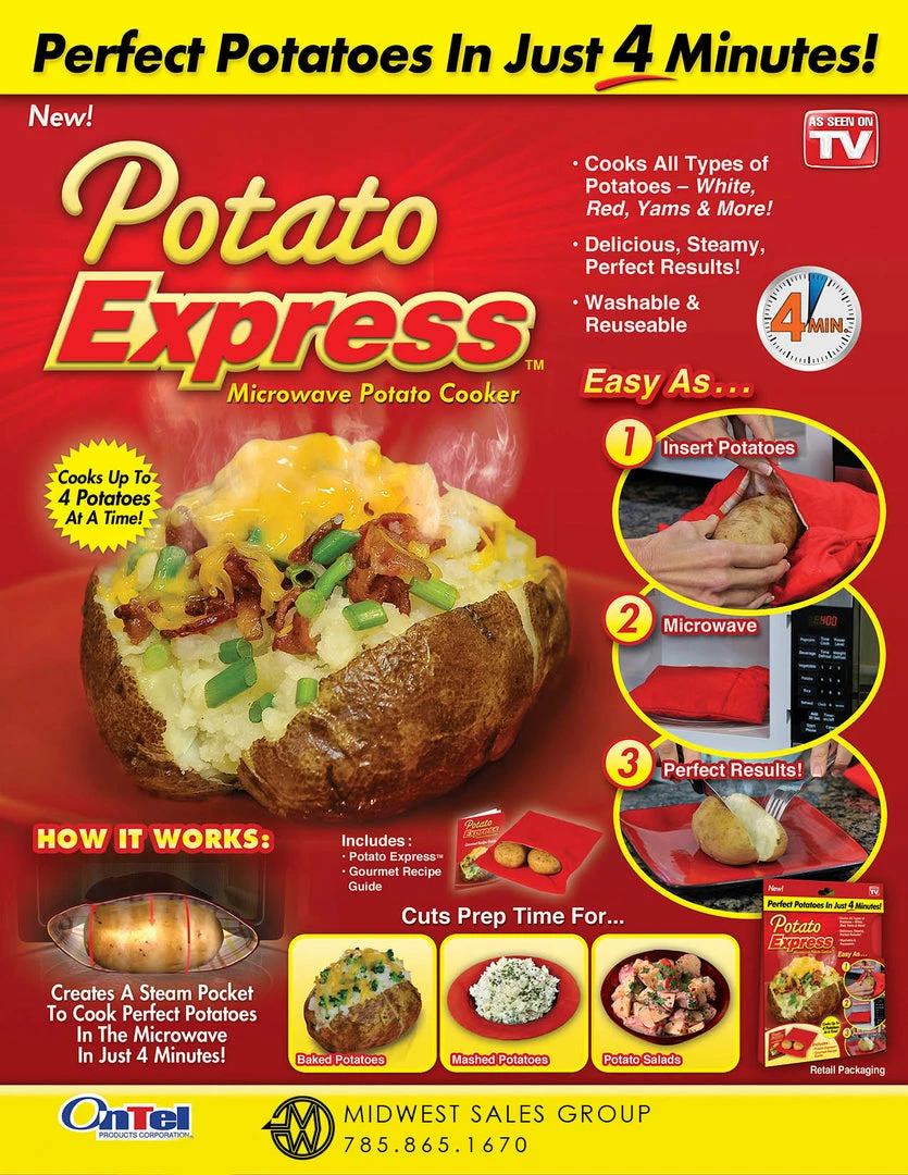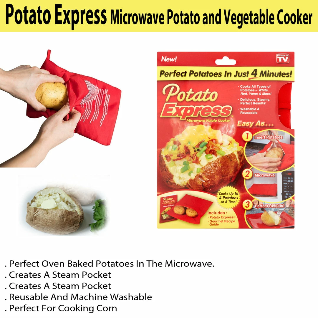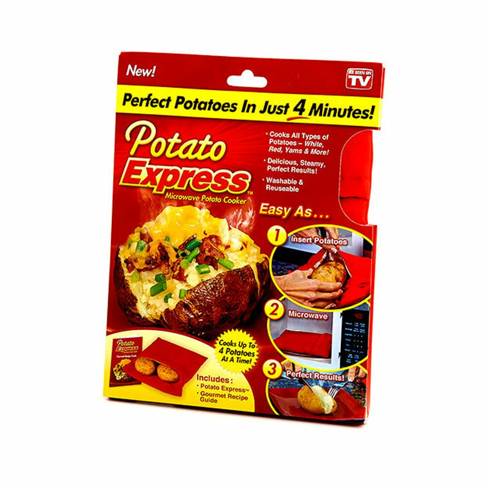Perfect oven baked potatoes in just 4 minutes with Potato Express. Potato Express is the fastest, easiest way to cook perfect oven baked potatoes in the microwave. The secret is the unique insulation design that creates a steam pocket to give your potato just the right amount of moisture; you will have a tender skin and a delicious, fluffy inside every time. Potato Express works on any type of potatoes: white, red, sweet, yams and more. Holds up to 4 large potatoes. Reusable and machine washable. Potato Express is great for potato skin, potato salad, homes fries, mashed potatoes or any of your favorite style potato. Also, perfect for cooking corn right in the husk or saving hard, day-old bread! Includes 1 Potato Express and Gourmet Recipe Guide. Potato or Veggie Express will ship, the products are the same and only differ in color.