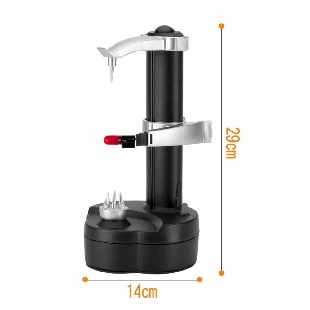 Automatic Peeling Machine is a quick and easy application that peels just the skin without washing any of the nutritious part of the vegetable. Automatic Peeling Machine is simple and safe to operate. In its base, it has a little plastic knife located into its base, designed for potatoes eyes or other blemishes removal. It can peel potatoes, sweet potatoes, tomatoes, zucchini, apples, pears, oranges, lemons, persimmon, mango, kiwi, cucumber, radish, papaya and other hard fruits and vegetables.Battery operated. Requires 4 x AA batteries.