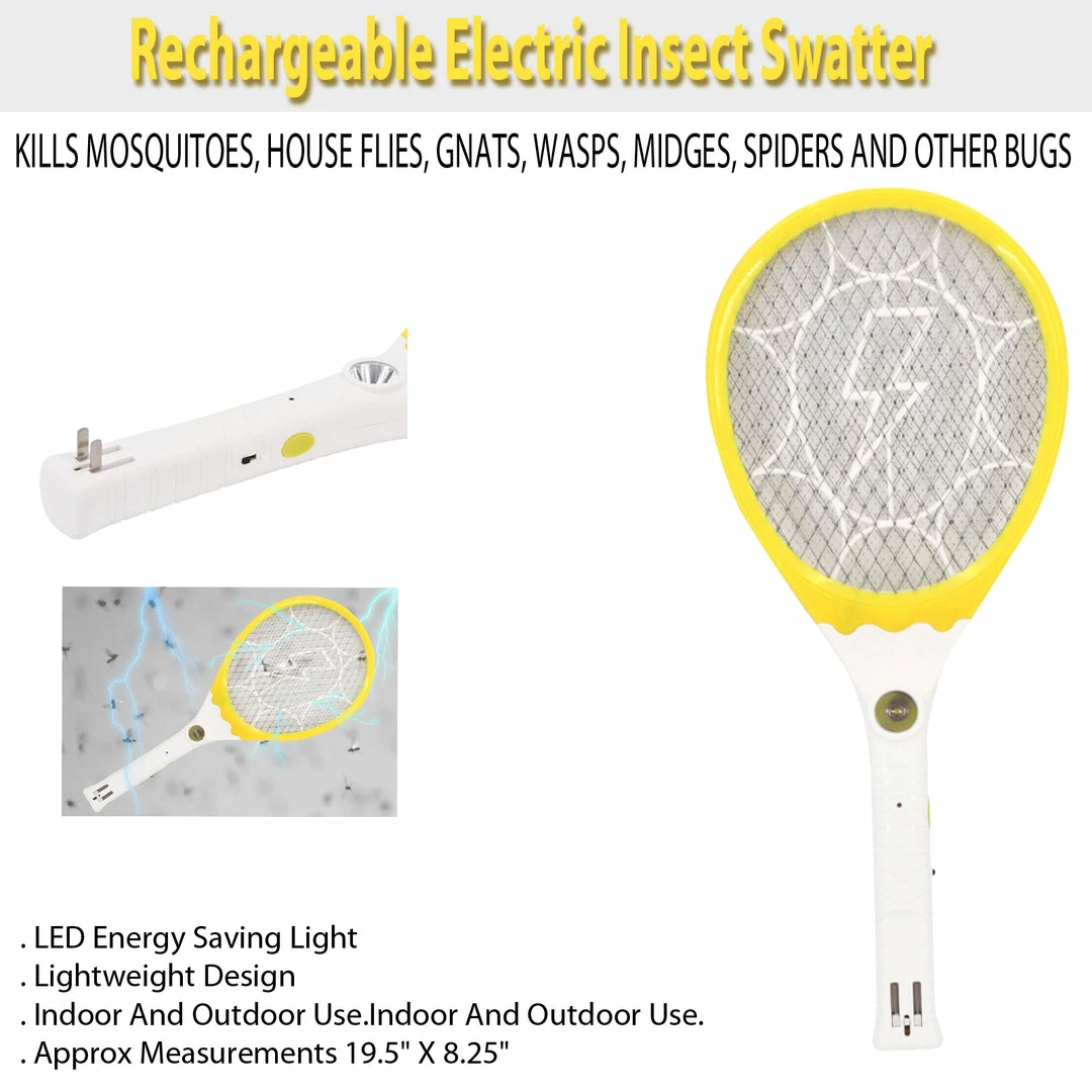 Electric Swat with LED energy saver. Safe to touch outer nets. Ideal for indoor / outdoor (dry weather) use. Net catches and eliminates the bugs in an instant. Zap all types of bugs. Rechargeable. Approx. measurements 19.5″ x 8.25″ AC 100V – AC 220V, 50-60HZ