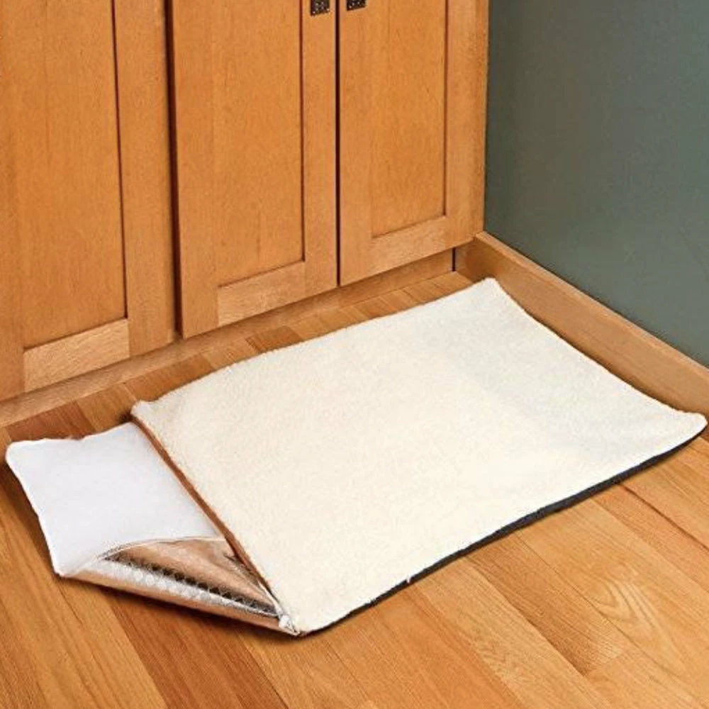 Inside the pet pad, there is a heat reflective layer that radiates your pet’s body heat back to them. There is no need for cords or plugins. Easy to store and lightweight for travel. The top layer is made out of a soft simulated sheepskin material.The non-slip base also allows for the heating pad to stay put. Outside cover can be machine washed and the inside should only be spot washed.Size: Large, Dimensions 24.19 in. x 35.43 in.