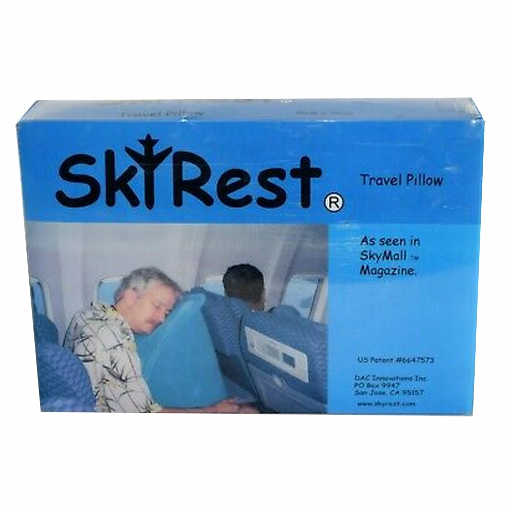 The Skyrest Travel Pillow is the first inflatable airline pillow designed for your comfort on long flights. Remember all those times spent sitting in an uncomfortable plane seat, wishing someone would invent a pillow that would make it comfortable to sleep on an airplane? The Skyrest Travel Pillow does exactly that! The inflatable Skyrest Travel Pillow is easy to pack and carry on any airplane. With its one-way valve, the Skyrest Travel Pillow is easy to quickly inflate and deflate during a flight. The wonderful design of the Skyrest Travel Pillow is the first of its kind to create a comfortable sleeping position on an airplane. Best of all, the Skyrest is designed for individuals from 4′ 10″ to 6′ 6″. Weight: 19 oz.Folded and Deflated Size: Width: 9″, Height: 4″, Length: 11″.Inflated size: Rear height: 15.5″, Front Height: 12″, Width: 16″, Depth: 12″.Dimensions: Length: 9″Height: 6″Width: 3″-