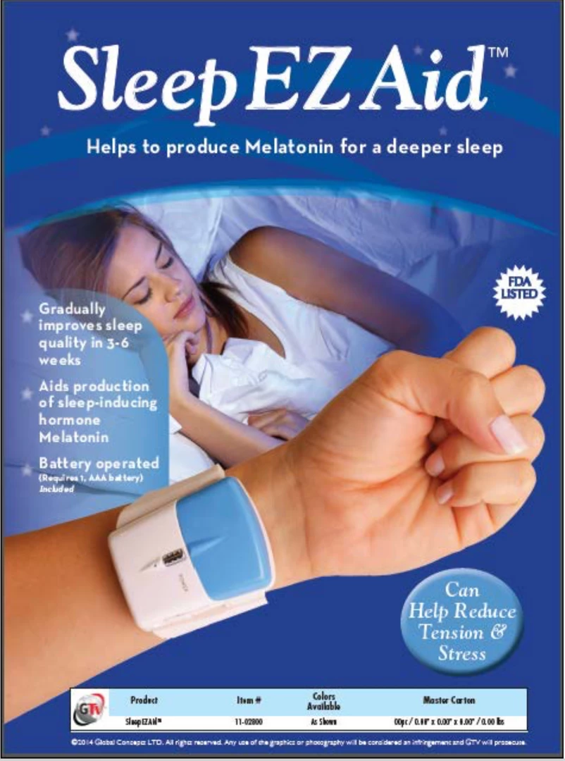 The Sleep Easy Sleep Aid is actually a watch-like wristband that is worn on the left-hand wrist. The Sleep Easy is the easiest and simplest way to work out against unusual sleep patterns. Helps to produce Melatonin for a deeper sleep and can help reduce tension and stress. Gradually improves sleep quality in 3-6 weeks. Requires 1 AAA Battery (Included). FDA LISTED.
