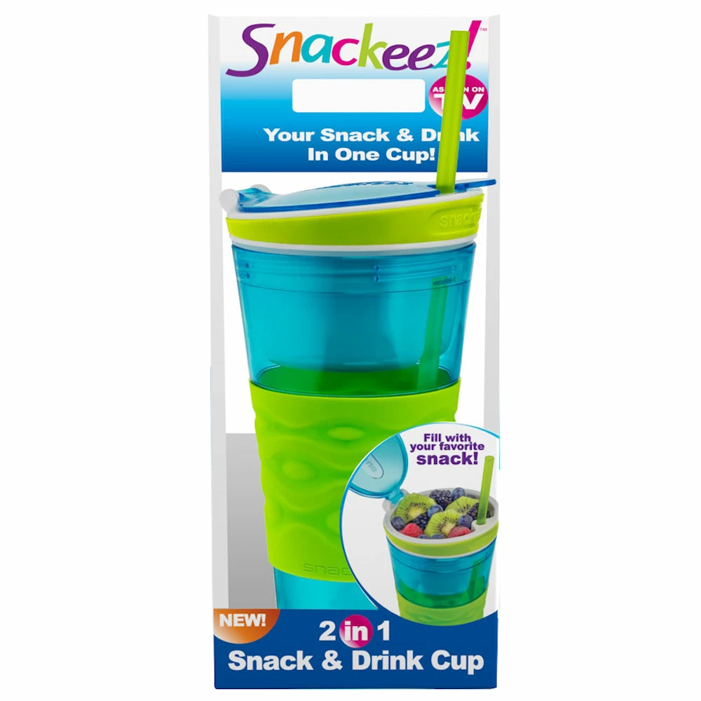 Snackeez is the all-in-one go-anywhere solution. The As Seen on TV Snackeez has two sections. One is made for food and one for your 16 oz. drink. The clever design satisfies thirst and hunger all in one compact package. The flip-top lid helps to prevent spills, and it comes with a straw. This Snackeez cup is also dishwasher safe for convenience! Don’t worry about germs in shared snacks: Snackeez ensures everyone has their own drink and snack. Perfect for social distancing parties! Dimensions (Overall): 6.88 Inches (H) x 4 Inches (W) 8oz Snack Cup – 16oz Drink Cup