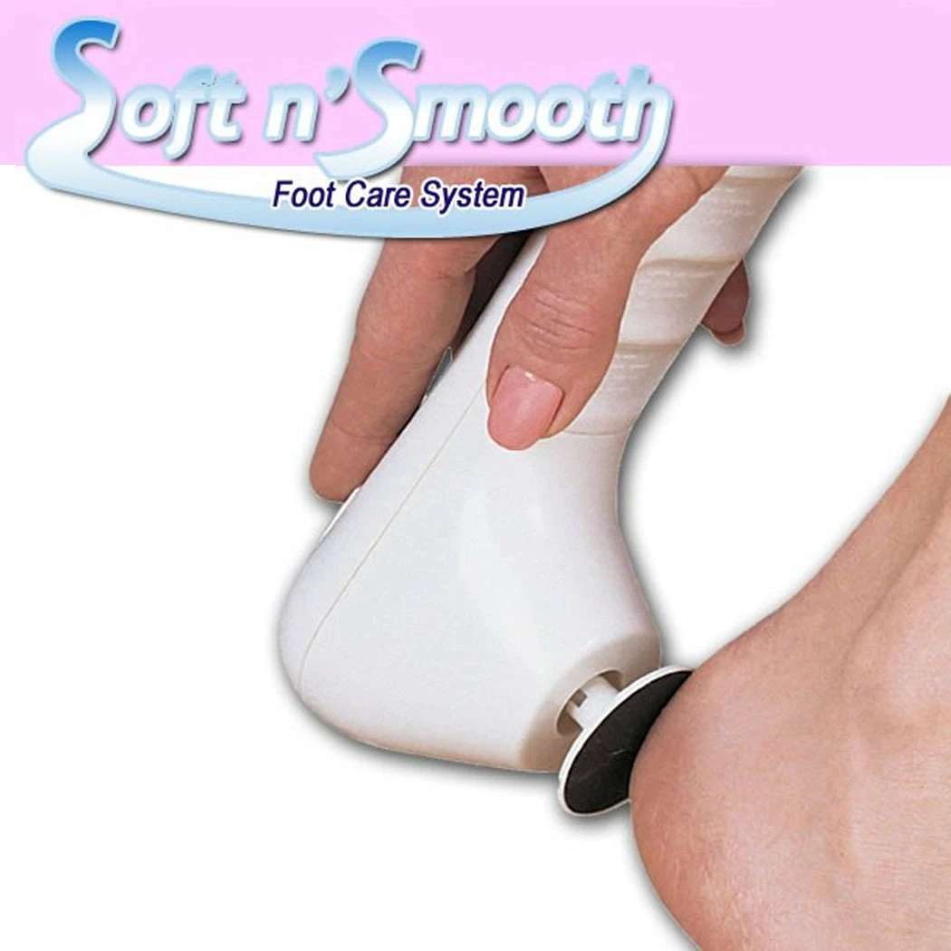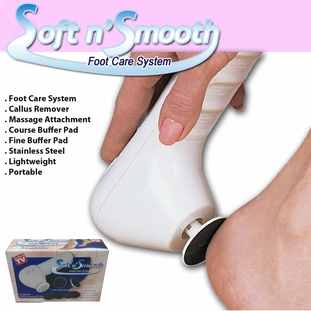 Soft n Smooth Foot Care System Keep your feet smooth and sleek with hardly any effort. Simply press the electric callus remover gently against corns or calluses…and watch them vanish! Feet are smooth as silk from heel to toe. Use the massage attachment to ease pain and discomfort in tired, aching feet. Great for knees and elbows, too. Lightweight, hand-held unit. Includes: 1 x Soft n Smooth handheld unit 3 x attachments (massage attachment, course buffer pad, fine buffer pad) 4 x refills (2 course and 2 fine) (Requires 4 AA batteries NOT included)