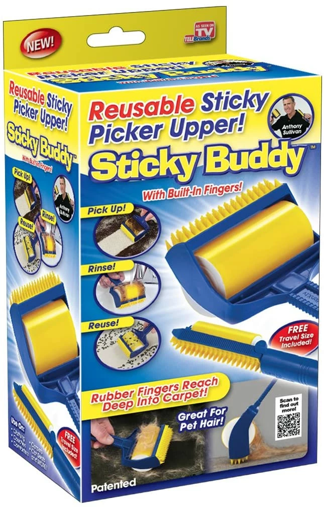 Sticky Buddy is the sticky lint roller that you can reuse. The rubber fingers reach deep into the fabrics, bringing up the deep fibers that the sticky roller can finish off the job. The adhesive is designed to be gentle on delicate fabrics, and tough enough to clean heavy jobs like carpet and wool. Simply use, rinse and reuse the sticky rollers for endless lint rolling. Package includes: Travel Size Sticky Buddy —
