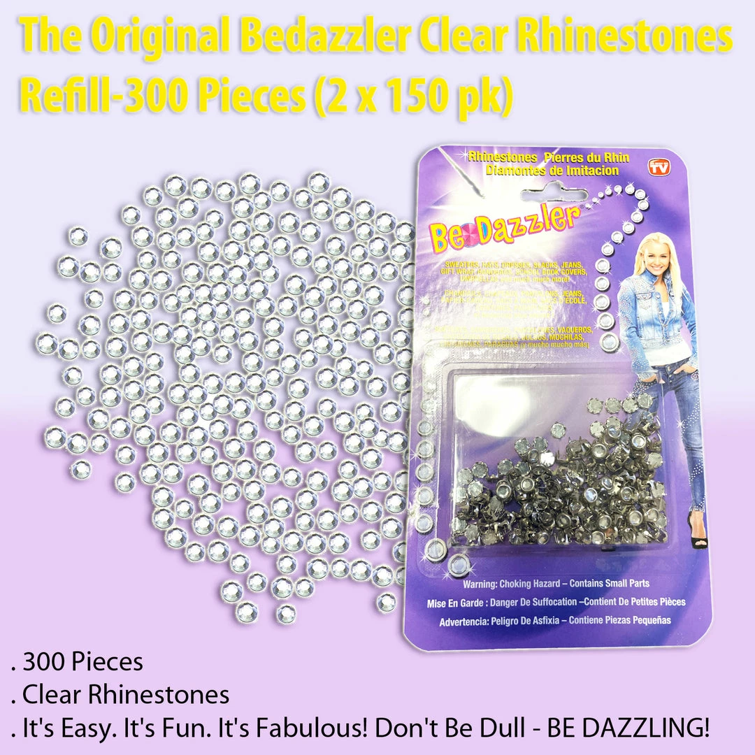 The Original Bedazzler Clear Rhinestones-300 Pieces (2 x 150 pk) This is the OFFICIAL replacement kit for the Bedazzler! This kit includes 300 Assorted Clear Rhinestones (Two packs of 150). Yes, the BeDazzler is back again and it’s the fashion craze of the season. Even if you’ve never threaded a needle, you’ll be BeDazzling in minutes. You can BeDazzle a hat, a shirt, a belt, a scarf or a sweater! It’s easy. It’s fun. It’s fabulous! Don’t be dull – BE DAZZLING! Includes: • 300 Assorted Clear Rhinestones ( 2 packs of 150 stones) Multi colored Rhinestones and Silver and Gold Studs also available- see our other listings