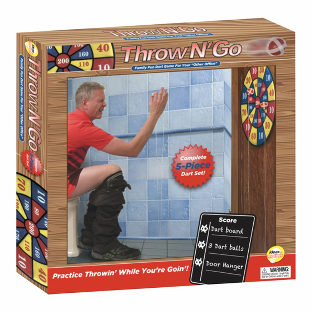 Practice throwing while you are going! Throw N’ Go dart game lets you practice during your down time. Your “other office” was never so much fun.Fun game with a dart board, 3 dart balls, and door hanger lets you practice throwing while in the bathroom. Product dimensions: 15” (H) x 2” (W) x 15” (L)
