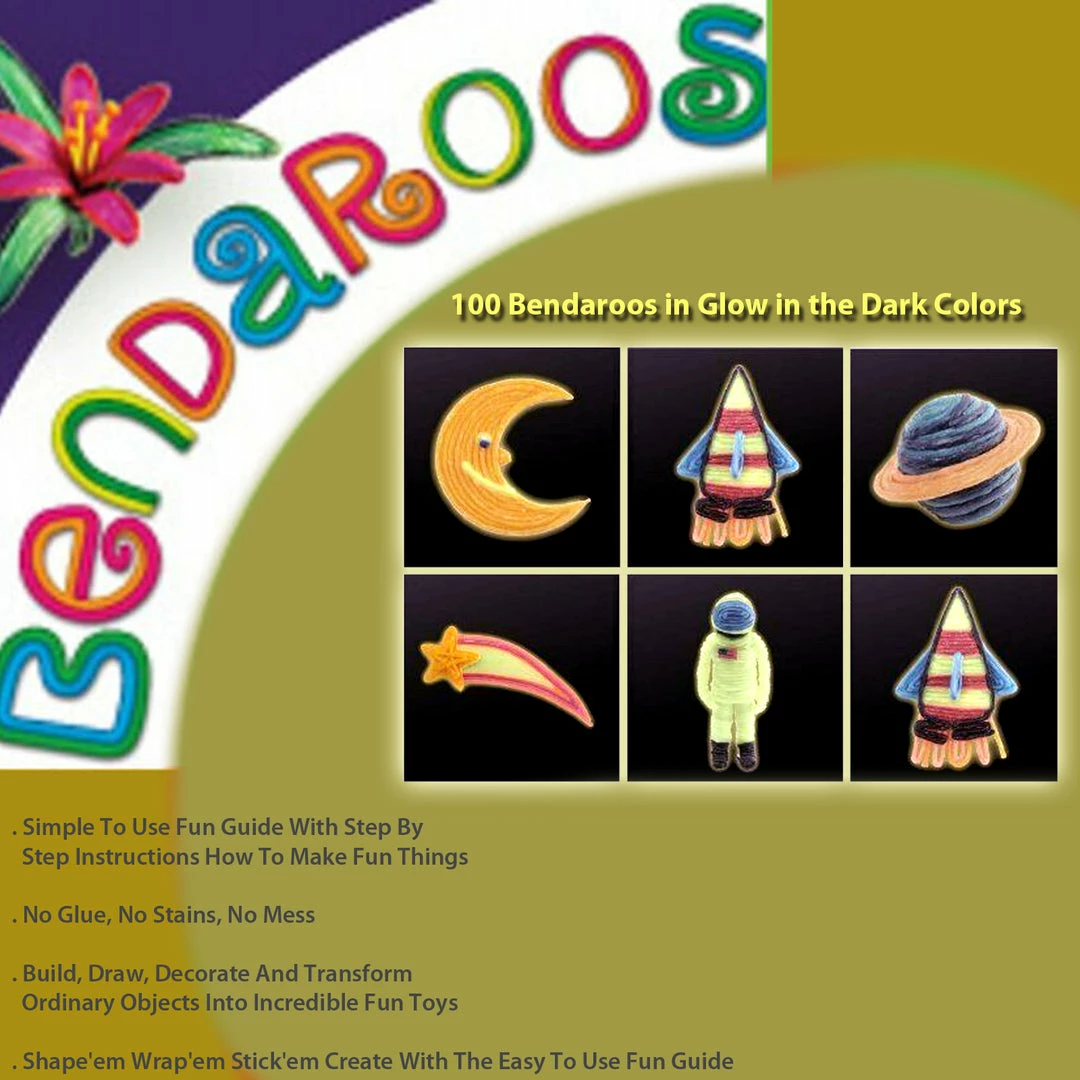 Create whatever you wish with the easy to use fun guide. Glow in the Dark Bendaroos are the amazing flexible building sticks.They stick and stay and then lift away for non-stop play. No Glue! No Stains! No Mess! Make Bendaroos do almost anything. Bendaroos always hold their shape plus they even unbend to use again and again. Bendaroos stick to walls, windows, and can decorate so many things.