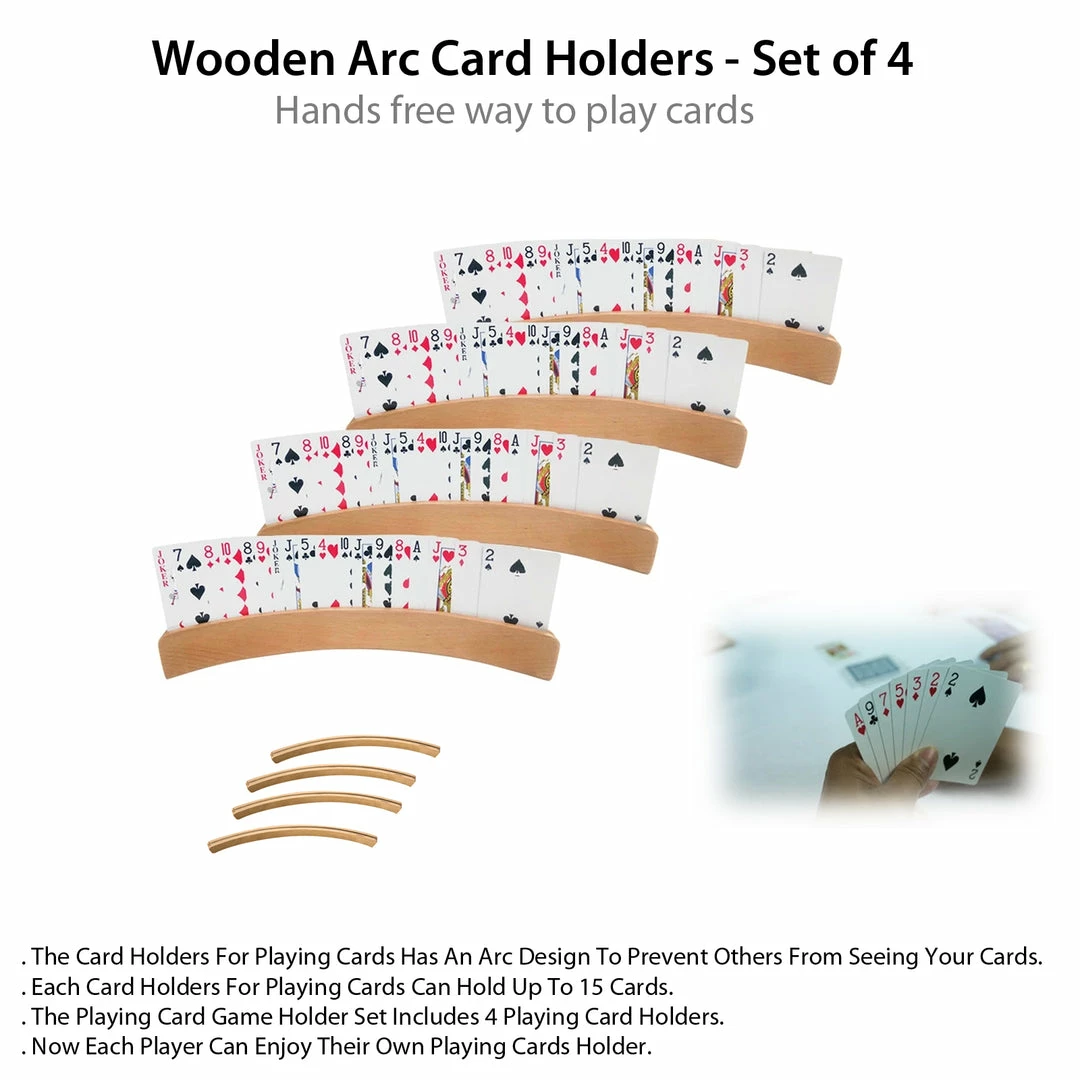 Enjoy any playing card game with the Wooden Arc Card Holders for playing cards. Whether you”re in need of a kids card holder, or you’re looking for a few playing card holders for seniors, these card holders for playing cards are great for any card game. Each card holder for playing cards has an arc design to help keep your playing cards discreet. Each game card holder can hold up to 15 standard sized cards. Each set includes 4 playing card holders, thus allowing each player to enjoy their own game card holder. Set of 4. Wood. Length: 13″