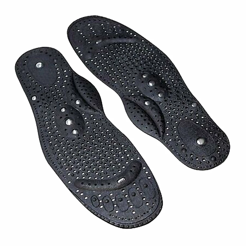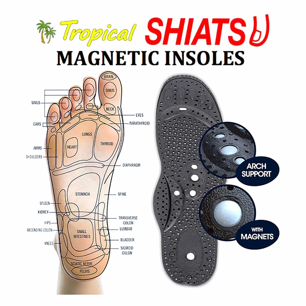 Tropical Shiatsu Massaging Men’s/Women’s Full Length Insoles are like 3 insoles in 1 Shiatsu massage, reflexology therapy and magnetic therapy These Shiatsu massaging insoles are covered with nodules that apply gentle pressure to vital acupressure points. Like the deep kneading of a massage therapist, these insoles help stimulate well-being throughout the body and relieve foot pain. Magnets are embedded in the insoles, helping to increase circulation, while air holes help keep your feet dry. (Caution: Not recommended for people with fractures and broken bones) Reflexology benefits: Improves blood circulation Relieves lower back pain Great arch support Magnet benefits: Relaxes muscle tension Relieves pain and speeds the healing process Features & Benefits: Nodules gently massage acupressure points, helping relieve foot pain Magnetic therapy helps increase circulation in the foot 250 air holes in each insole allow air to circulate, keeping feet dry Allows air to pass through for ventilation Convenient, washable and long lasting Insoles can be trimmed to fit Includes one pair of insoles (one left and one right)
